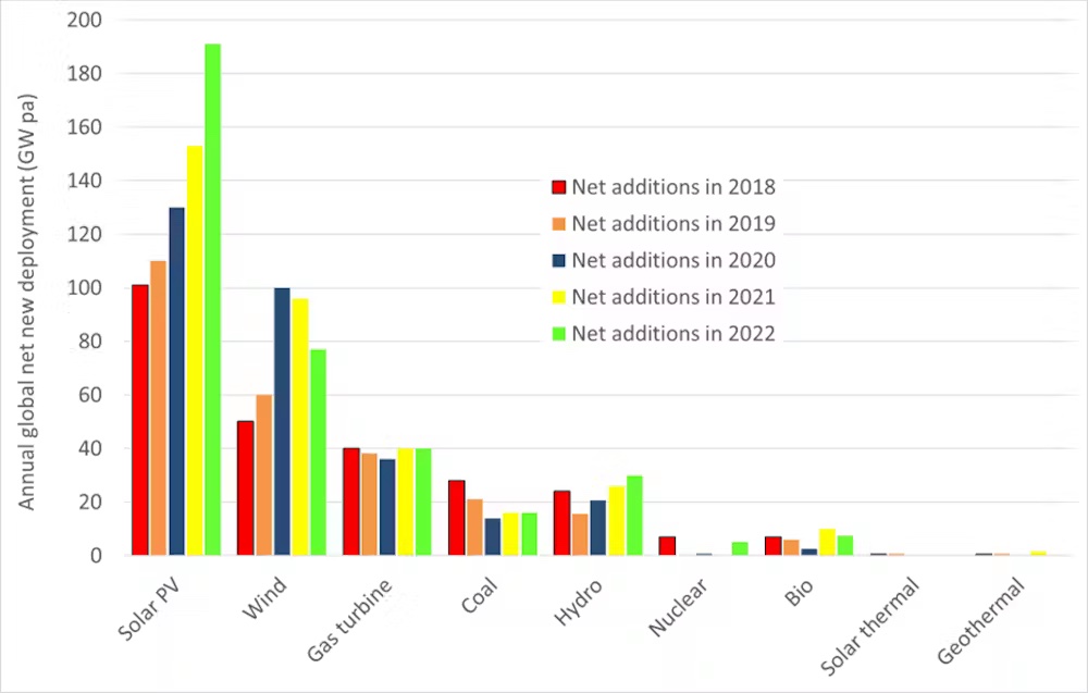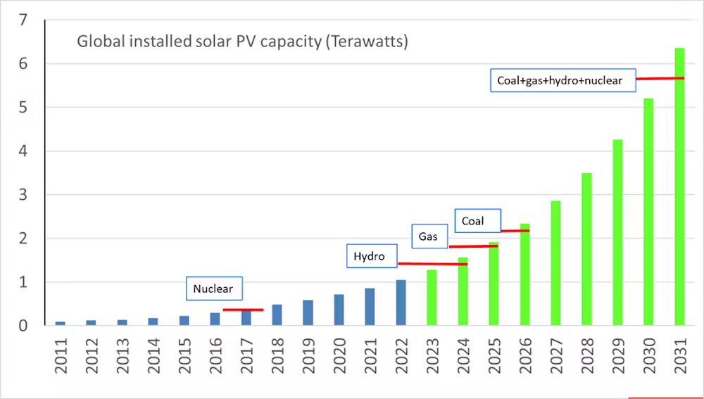 Total solar capacity tipped over 1 terawatt (1,000 gigawatts) for the first time last year. The sector is growing at around 20% a year. If this continues, we’ll hit 6 terawatts around 2031. In capacity terms, that would be larger than the combined total of coal, gas, nuclear and hydro.
