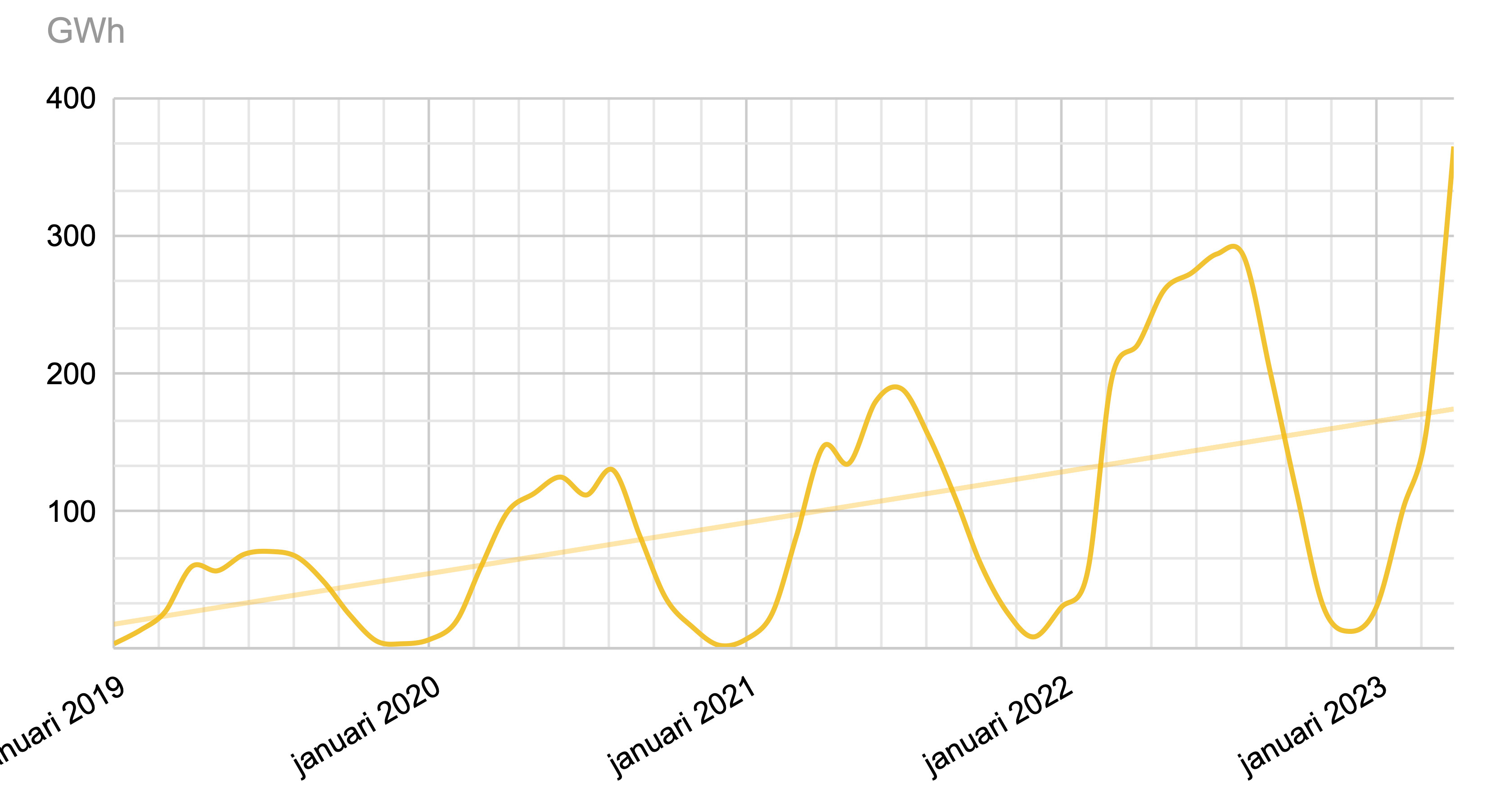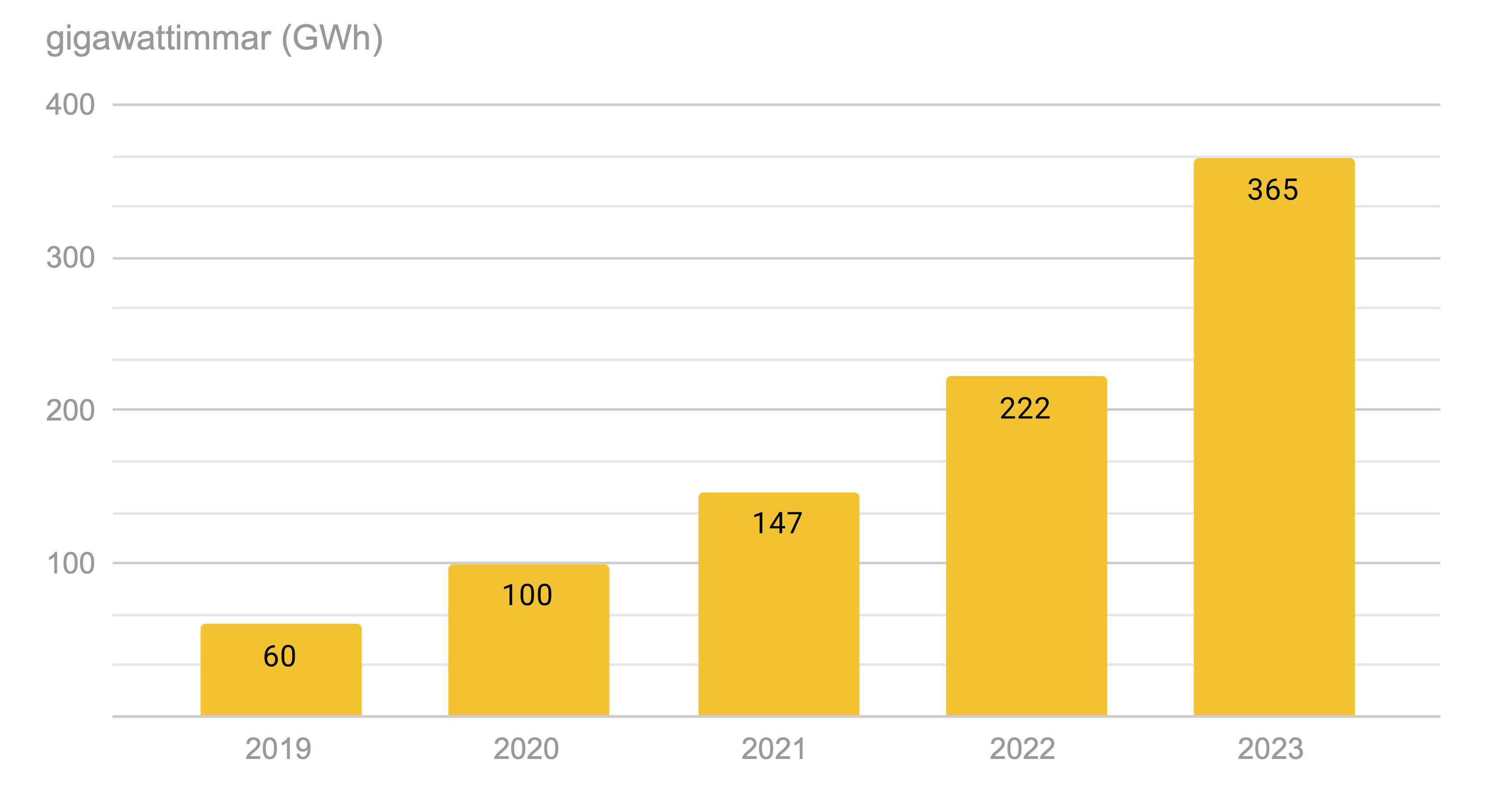 | Miljarder wattimmar (GWh) | 2023 | 2022 | 2021 | 2020 | 2019 |