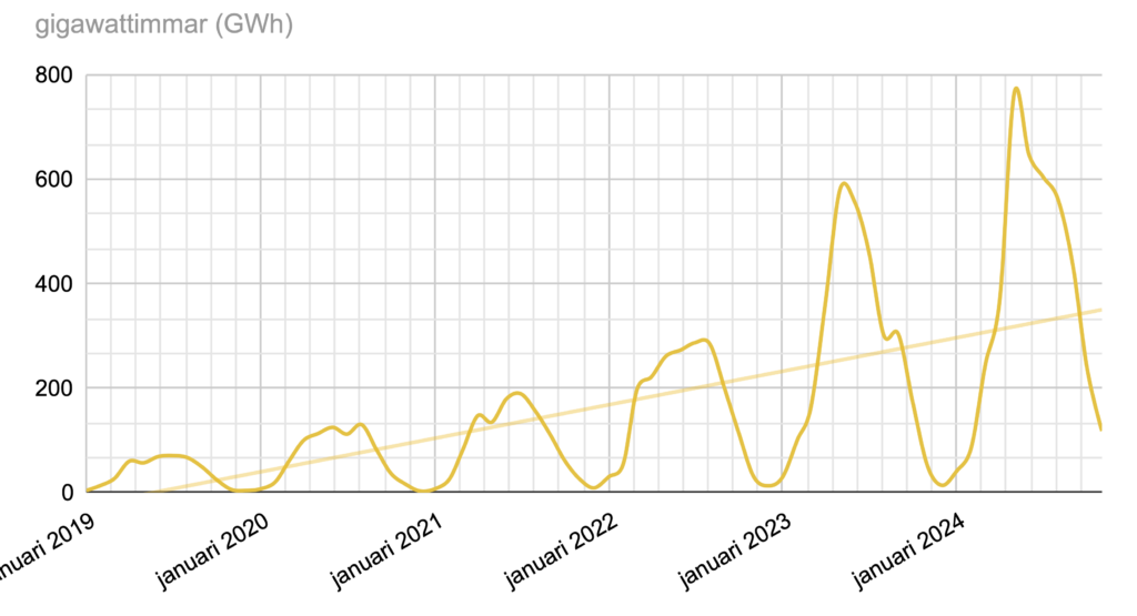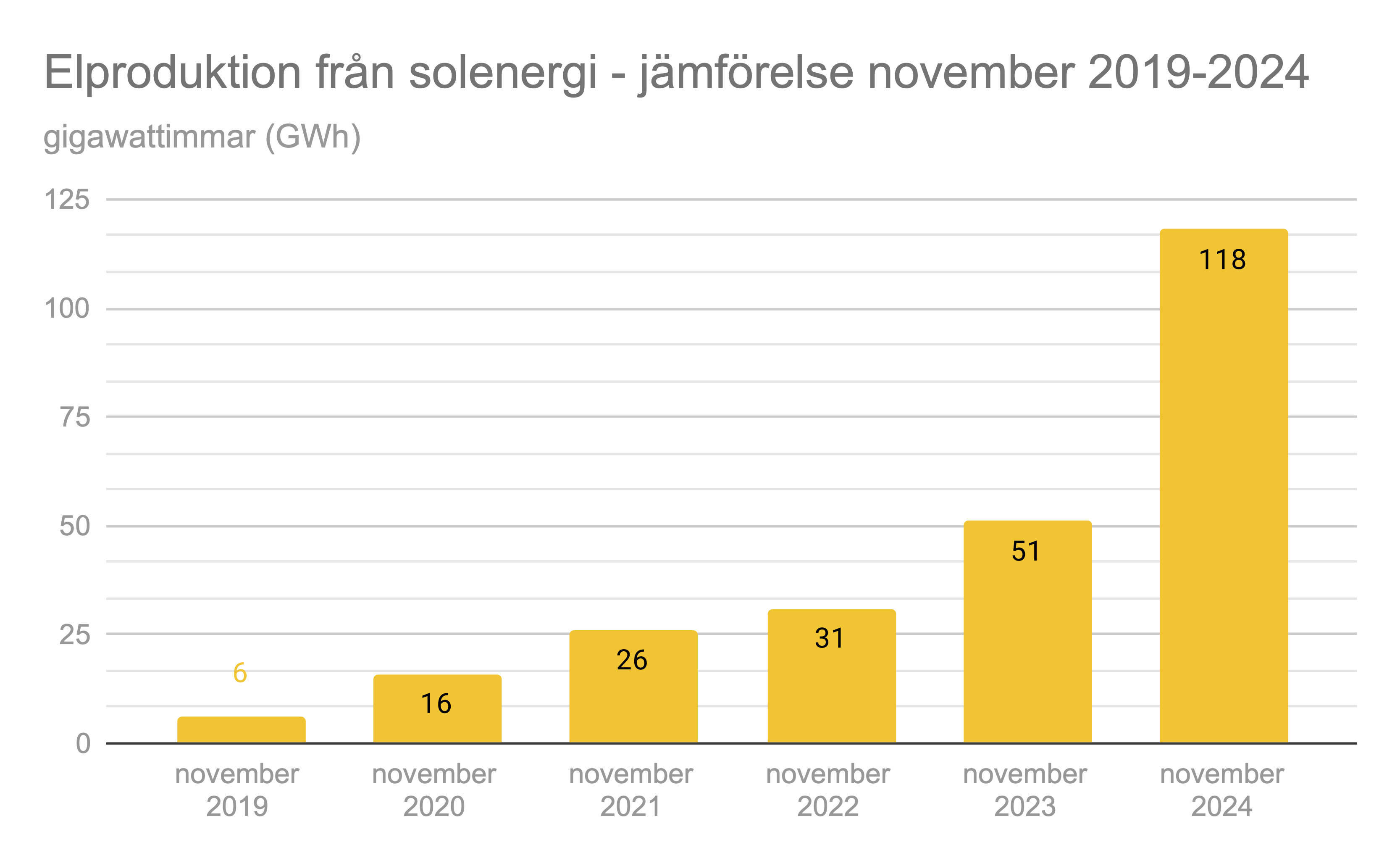 Elproduktion från solenergi i Sverige januari 2019 – november 2024 (gigawattimmar)