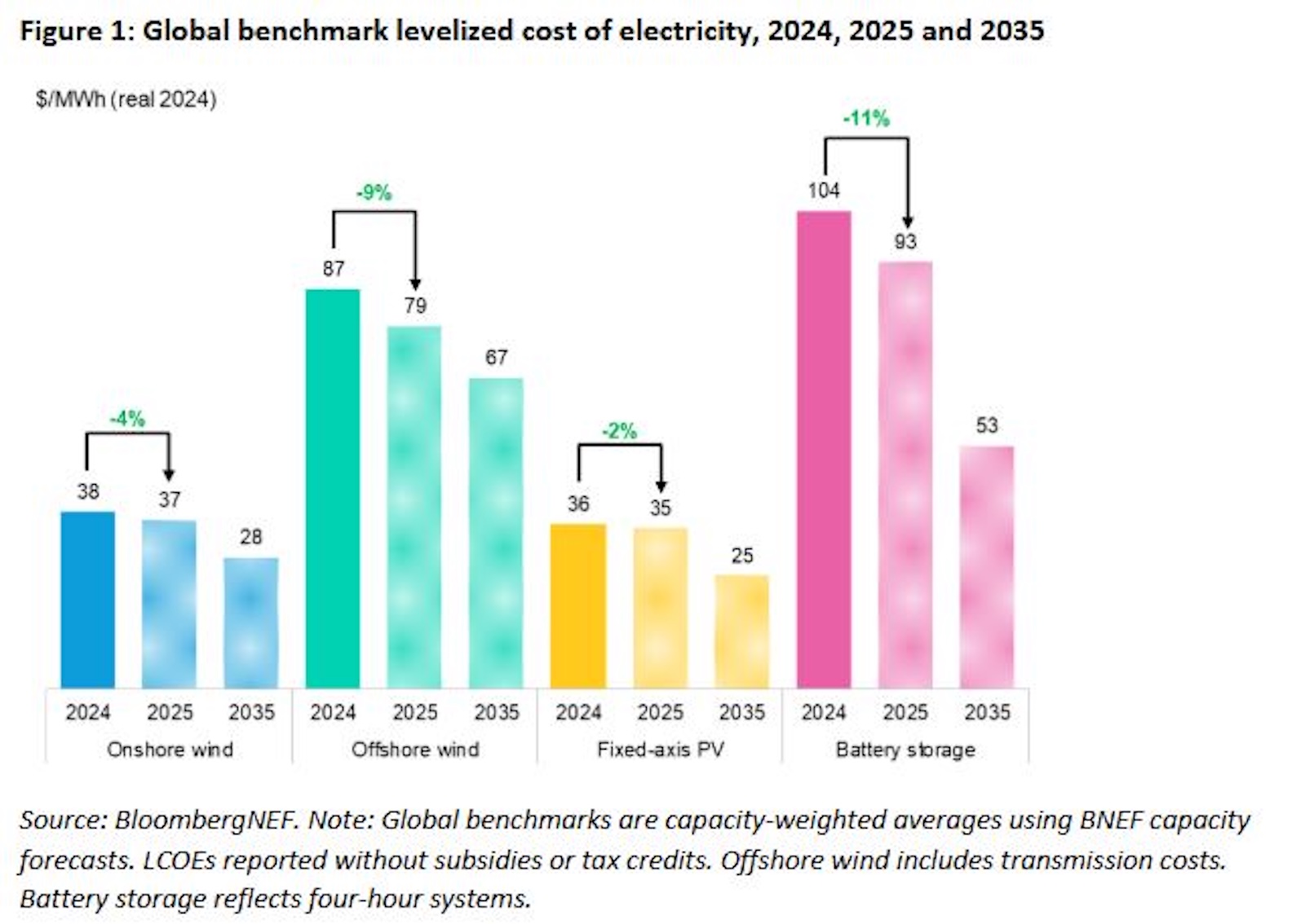 Bloombergs prognos för 2025 är att kostnaden för fri energi sjunker globalt