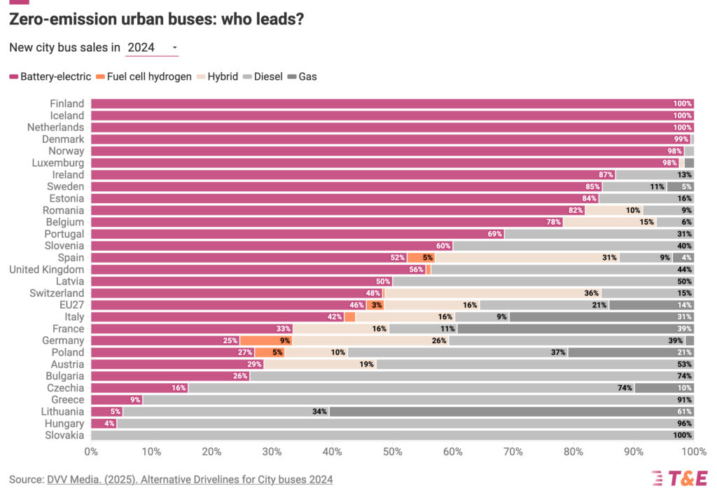 Nederländerna leder utvecklingen, där hela 96 procent av nya stadsbussar under 2024 var elektriska. Spanien och Tyskland visar också hög andel elektriska stadsbussar, med över 50 procent elektriska fordon under samma period. Länder i Östeuropa, som Polen och Rumänien, har däremot en långsammare uppväxling, med en betydligt lägre andel elektriska stadsbussar.