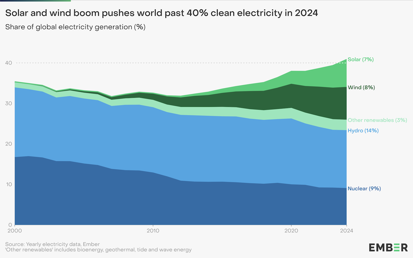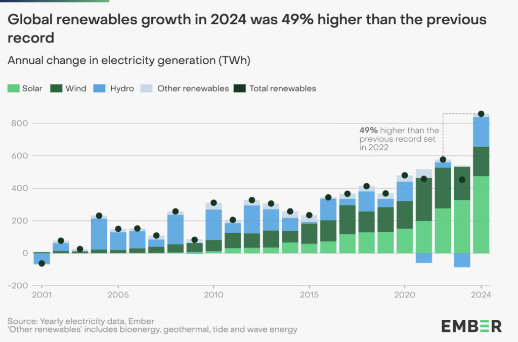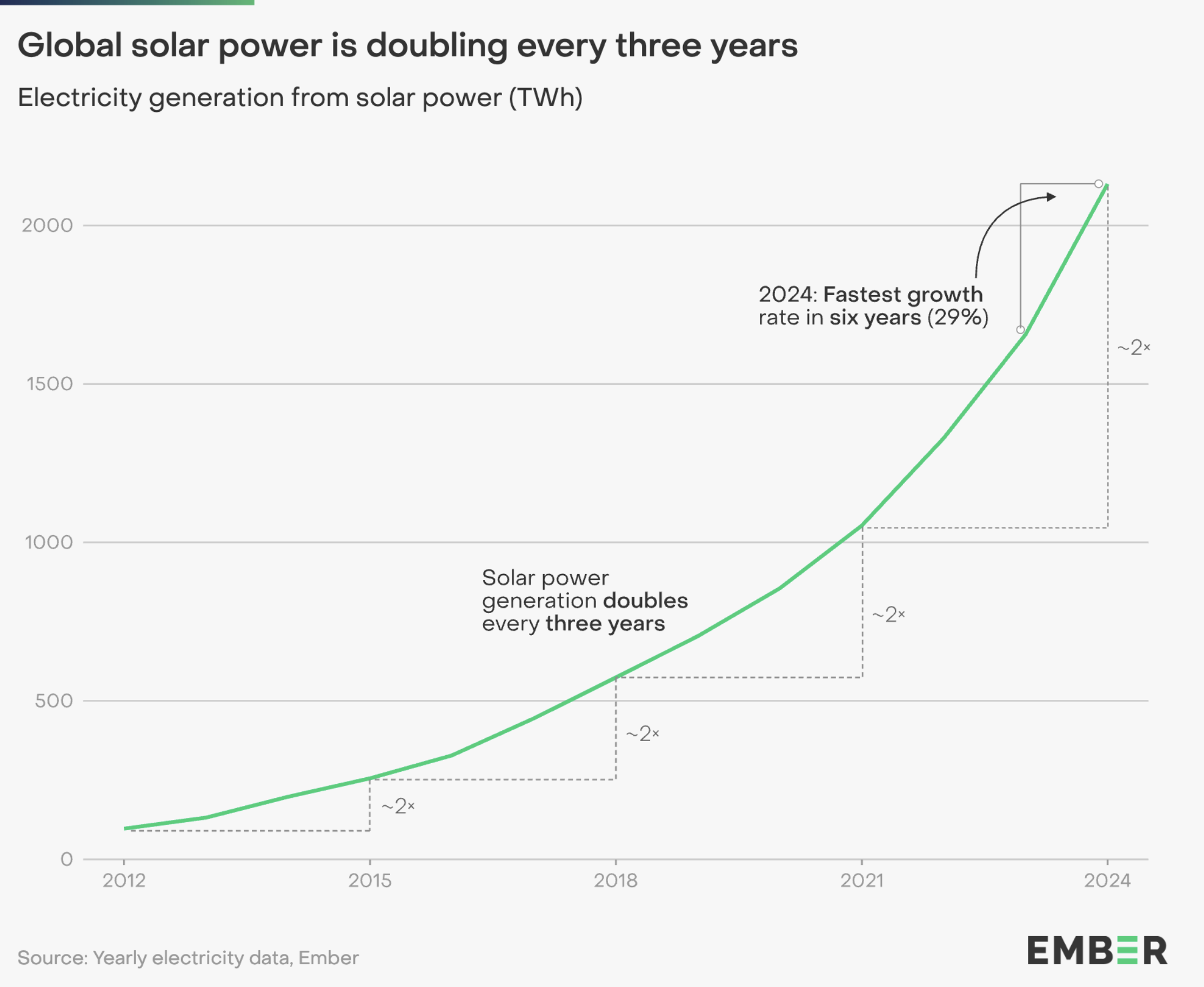 Solenergi fortsätter att vara den snabbast växande källan till elektricitet. Produktionen har fördubblats på bara tre år och passerade 2 000 miljarder wattimmar 2024. Under året var solenergi den största nya källan till elproduktion globalt, med en ökning på 474 miljarder wattimmar. Över hälften av denna ökning kom från Kina, där utbyggnaden av solenergi gick i rekordfart. I Kina täckte ren elproduktion 81 procent av den ökade efterfrågan. Den globala solenergikapaciteten nådde 2 tusen miljarder watt – en fördubbling på bara två år.