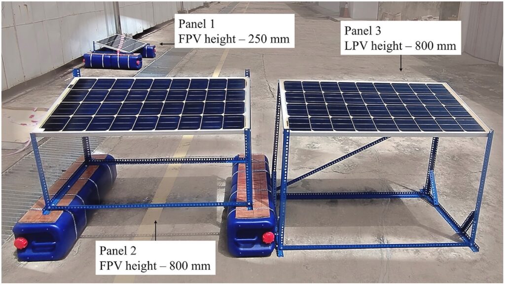 De tre systemen som jämfördes var en flytande panel placerad 250 millimeter ovanför vattenytan (FPV 1), en flytande panel placerad 800 millimeter ovanför vattenytan (FPV 2), samt en markbaserad panel placerad 800 millimeter ovanför marken (LPV).