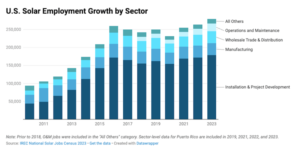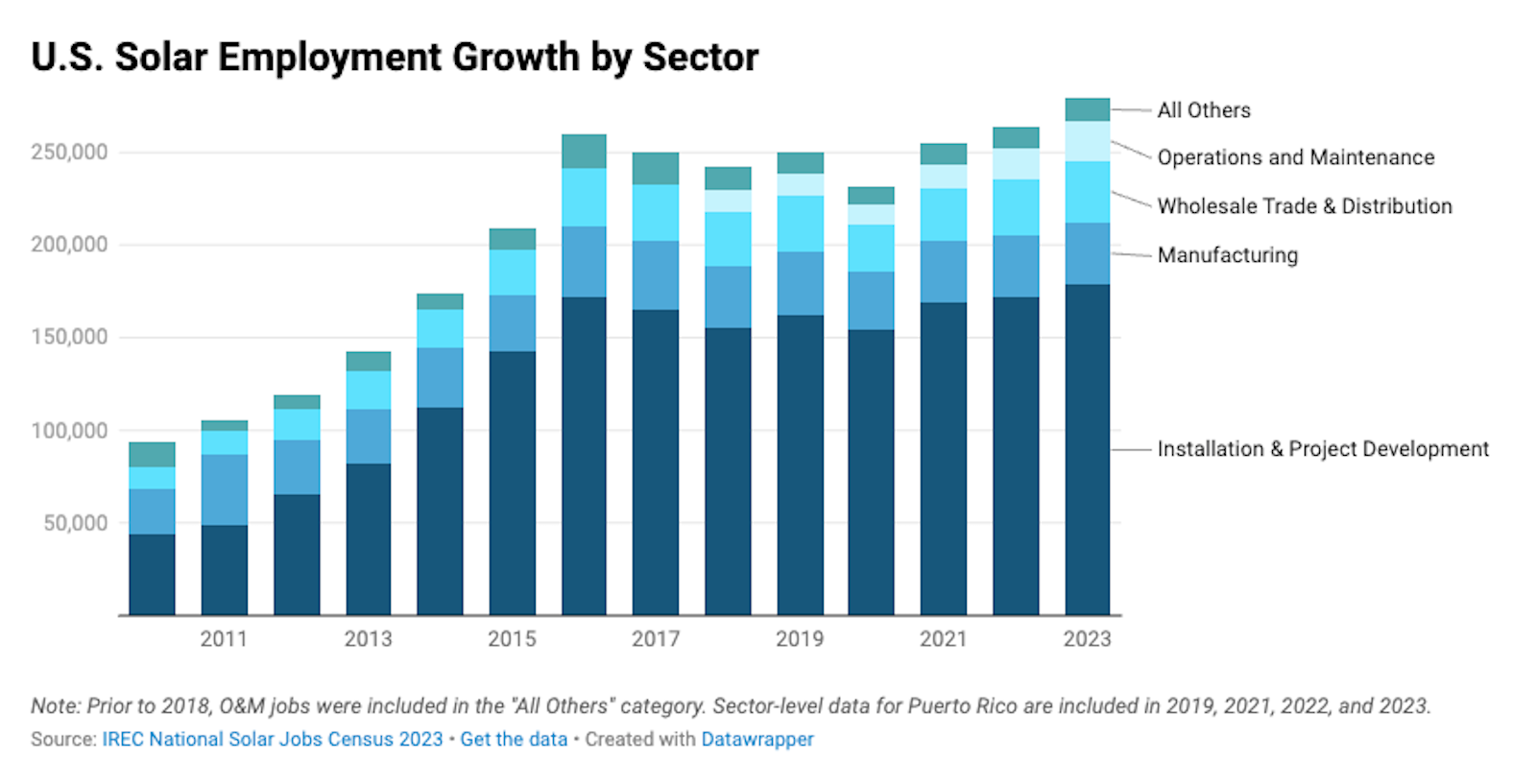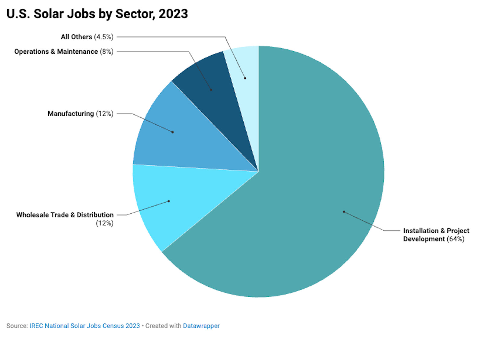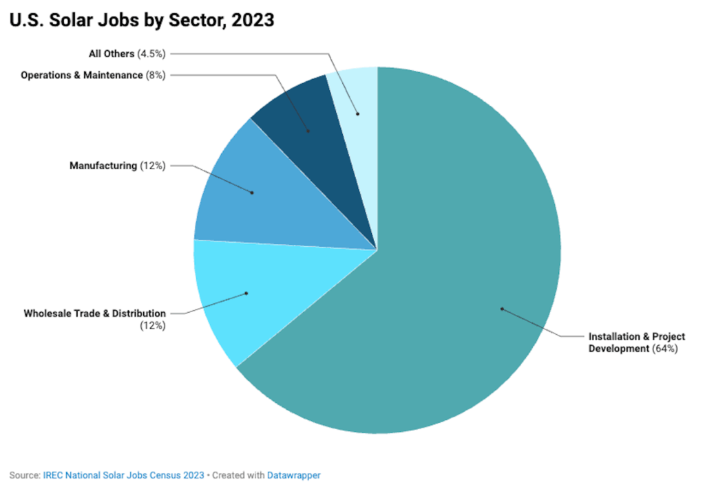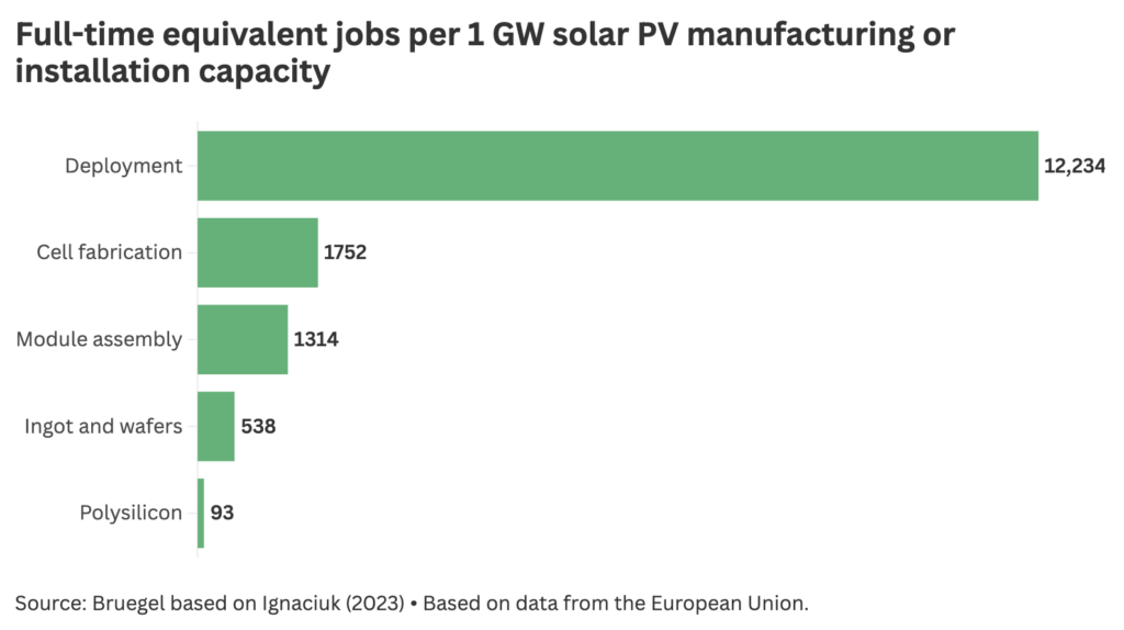 De flesta jobben inom solenergi handlar om installation, inte tillverkning. I Europa skapar en miljon watt (megawatt) solenergi runt 12 000 jobb under projektets livstid – varav 4 000 i tillverkning. Tre fjärdedelar av jobben finns alltså i andra delar av produktionskedjan. I USA är över 80 procent av soljobben inom installation, projektutveckling eller underhåll. Endast 12 procent är i tillverkning.