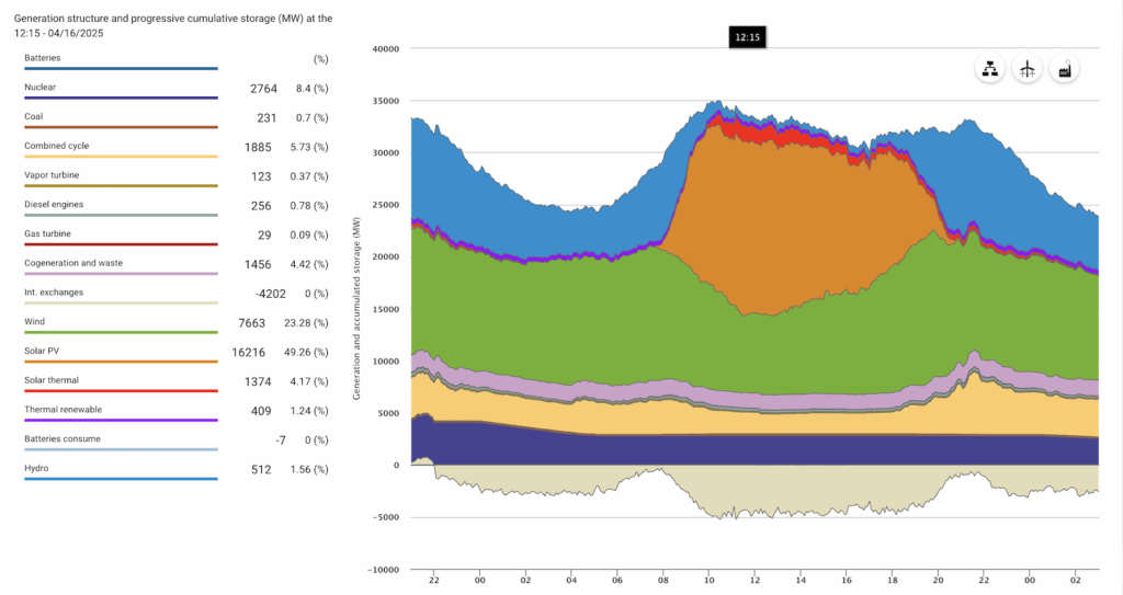 Vid 11:15 på förmiddagen denna dag producerade vind och sol tillsammans 100,63 procent av den faktiska efterfrågan på elektricitet – något som aldrig tidigare skett på en vardag i Spanien.