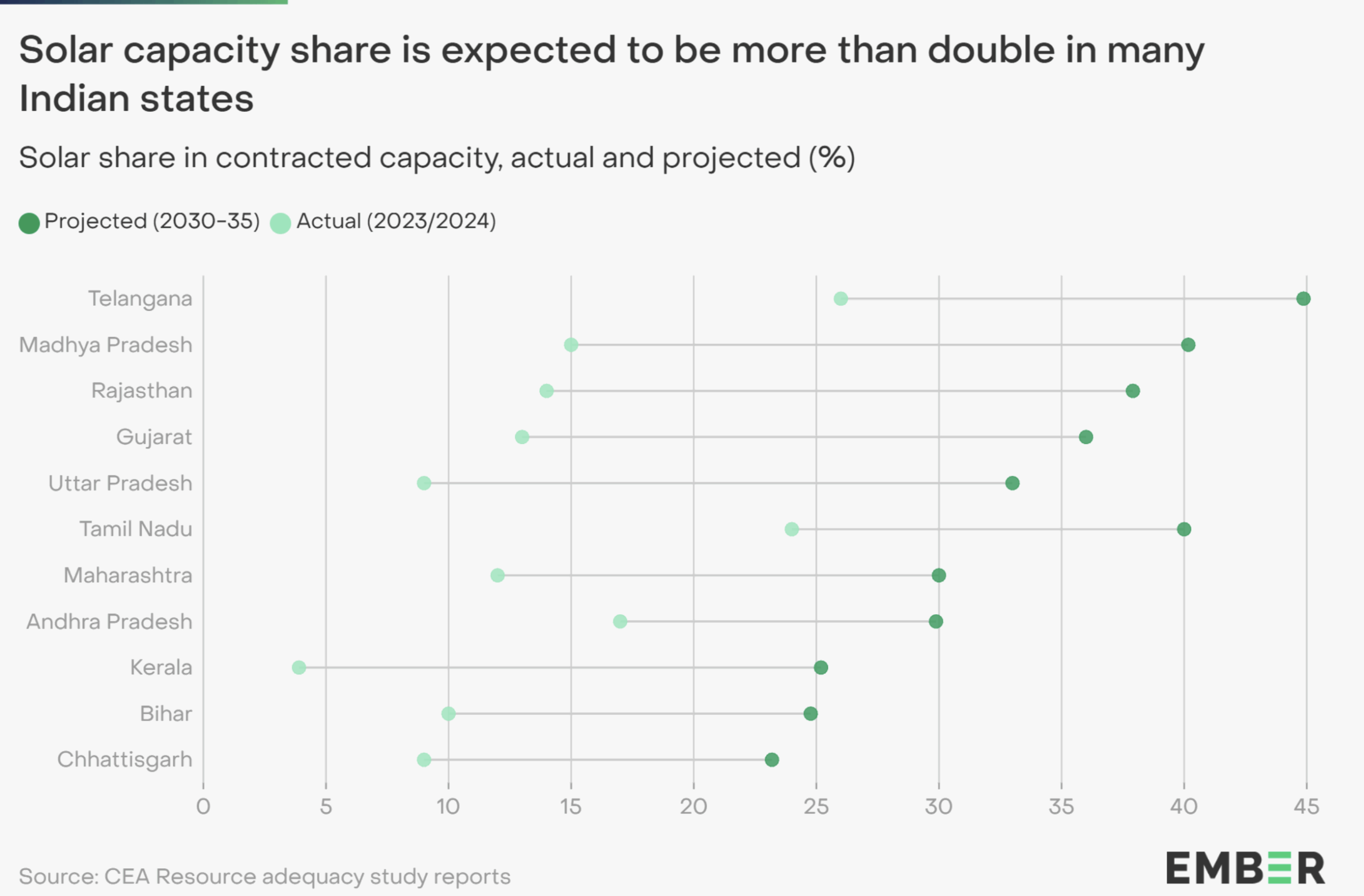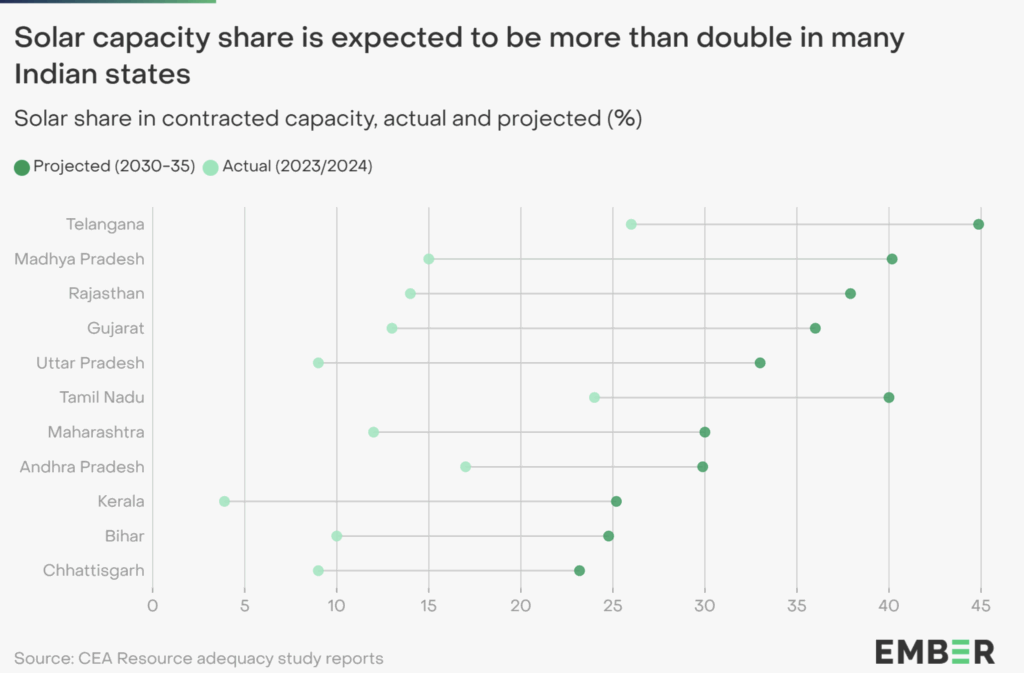 Indiens el- och värmebehov växer snabbt. Prognoser visar att hushållen kommer stå för 31 procent av den totala elförbrukningen 2031. Samtidigt planeras en kraftig ökning av solenergi, från 105 miljarder watt (gigawatt) installerad kapacitet 2025 till 365 miljarder watt 2032.