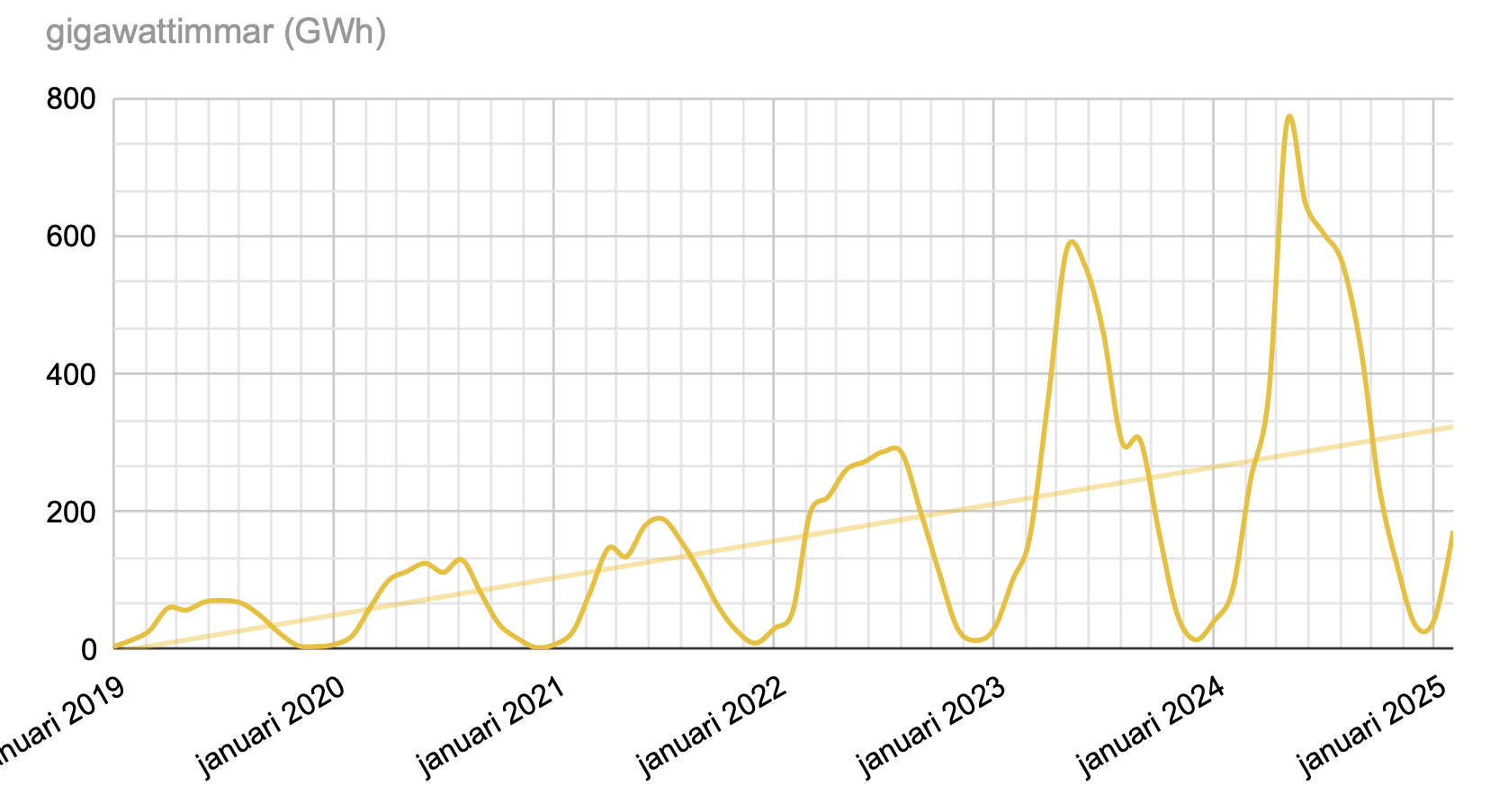 Elproduktion från solenergi i Sverige januari 2019 – mars 2025 (gigawattimmar)
