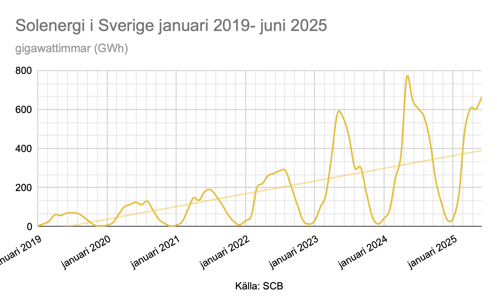 Elproduktion från solenergi i Sverige januari 2019 – juni 2025 (gigawattimmar)