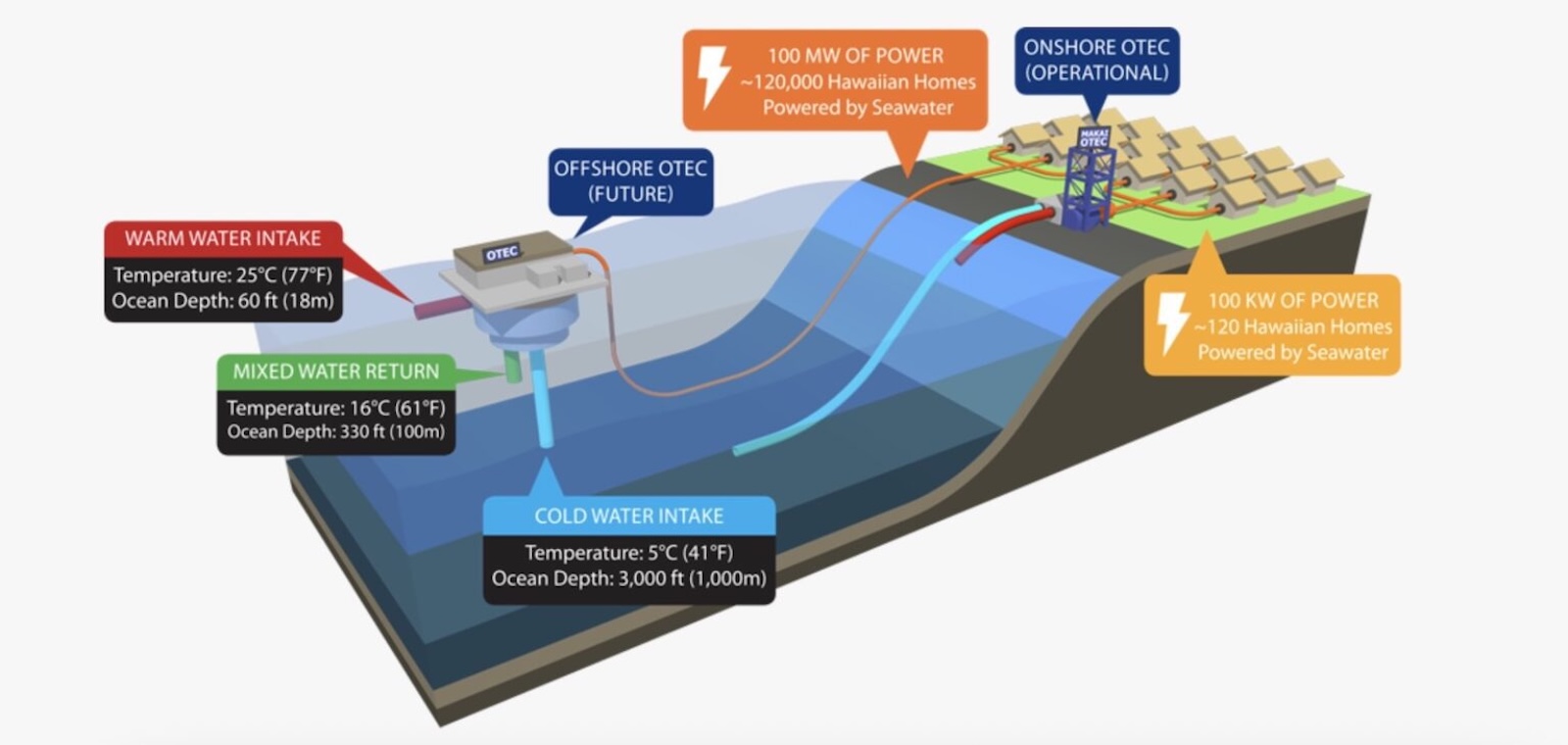 Utmaningen är tekniskt komplex: ett upp till en kilometer långt rör ska pumpa upp djupvatten, och tekniken kräver robusta lösningar för att fungera i öppet hav. Tidigare projekt, som Lockheed Martins planerade 100 megawatt-anläggning vid Kina, har stannat på idéstadiet. I dag finns endast små anläggningar i drift, bland annat på Okinawa i Japan och ett försök i Hawaii.
