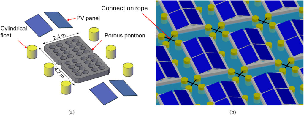Forskare vid Oslo Metropolitan University har undersökt en ”soft-connected” flytande solenergianläggning som består av sex pontoner, var och en med fyra dubbelvinklade solpaneler. Pontonerna hålls ihop av flexibla rep och förankras med sträckta linor som ger stabilitet i djupa vatten.