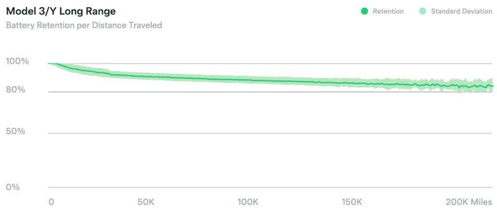 - Långsiktig kapacitet: Studier visar att Tesla Model 3 har kvar cirka 85 procent av kapaciteten efter 3200 mils körning. Andra märken visar liknande resultat, och bara 1,5 procent av ett stort stickprov på 15 000 bilar behövde ett batteribyte.