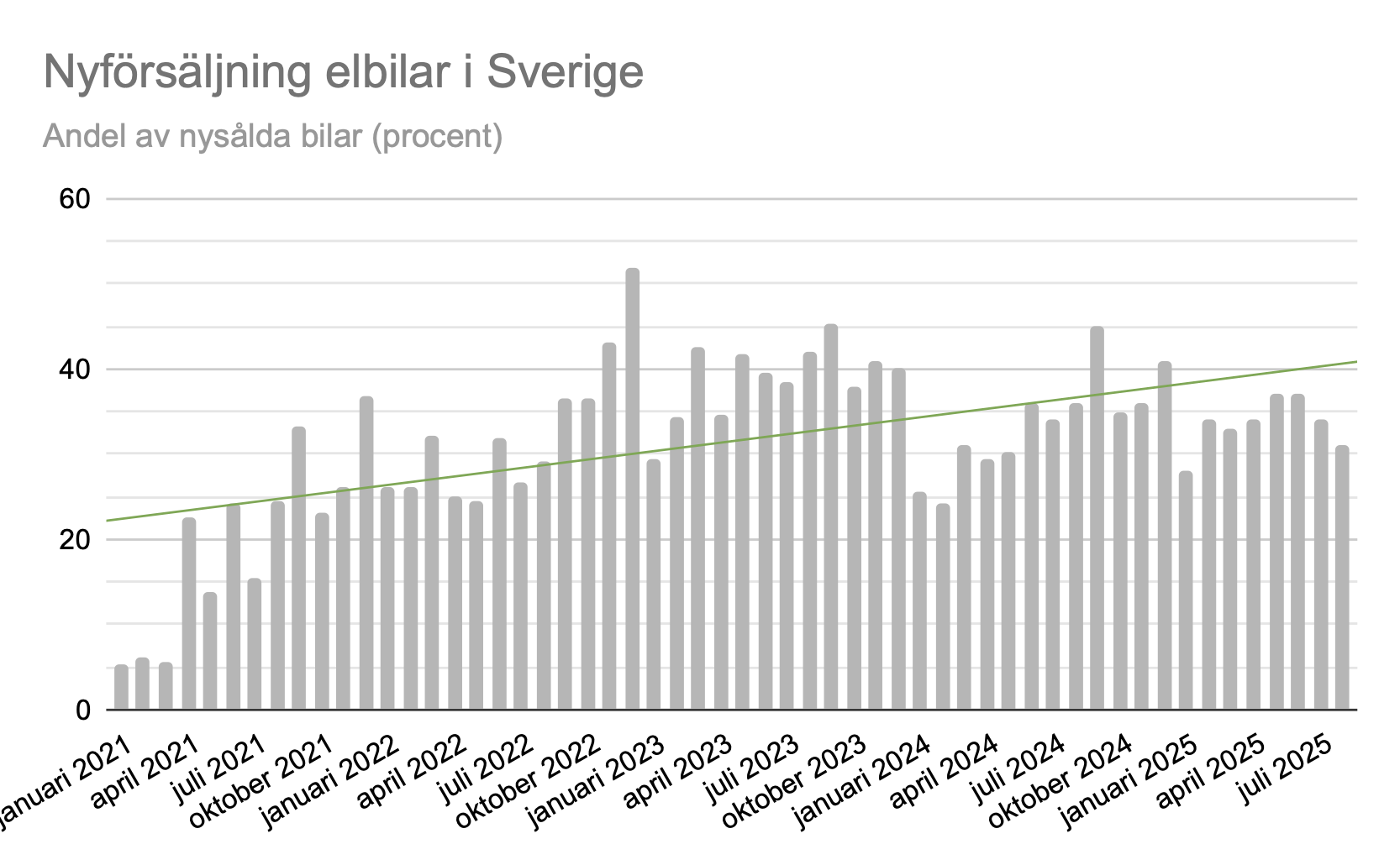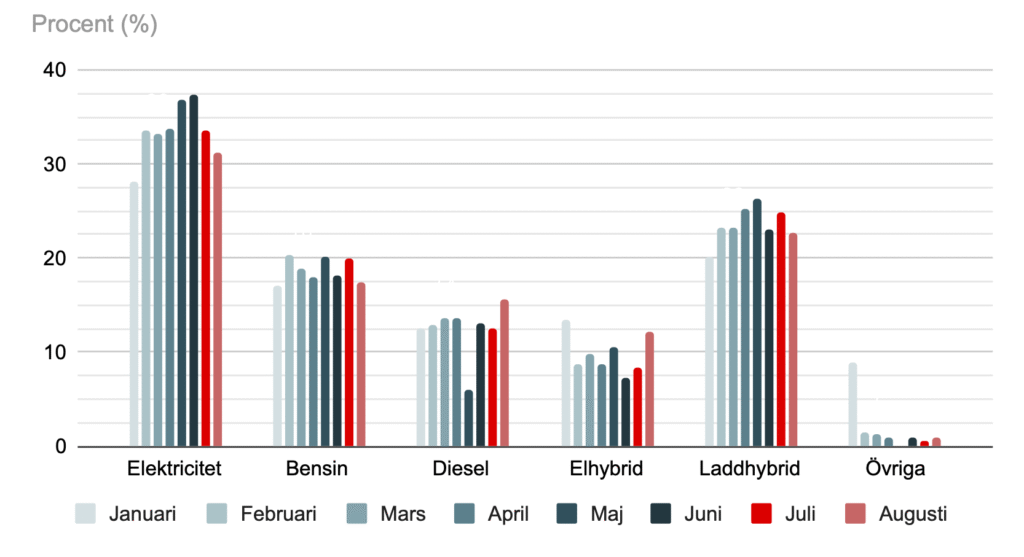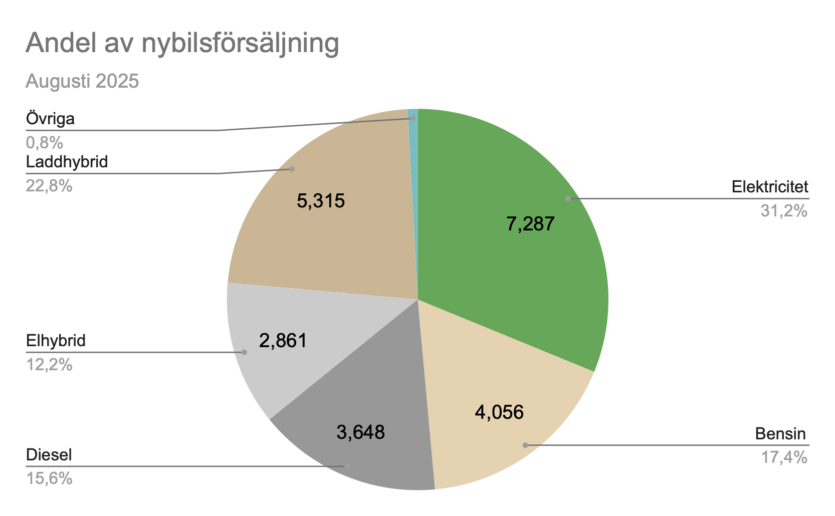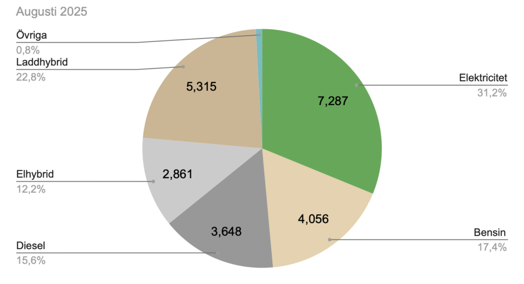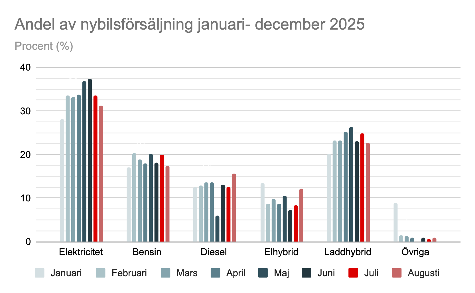 Bränsleslagens andelar av nybilsförsäljning i Sverige augusti 2025