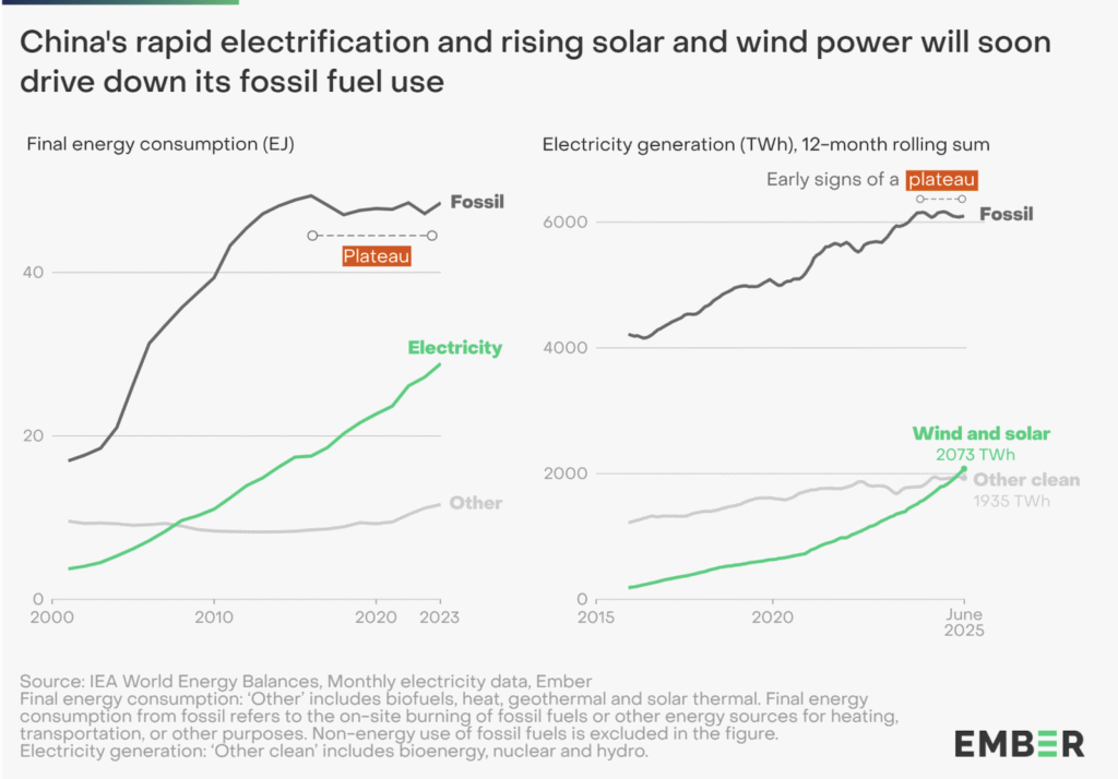 - Solenergi och vindkraft i Kina har fördubblats på tre år och passerade kol i installerad kapacitet i början av 2025.