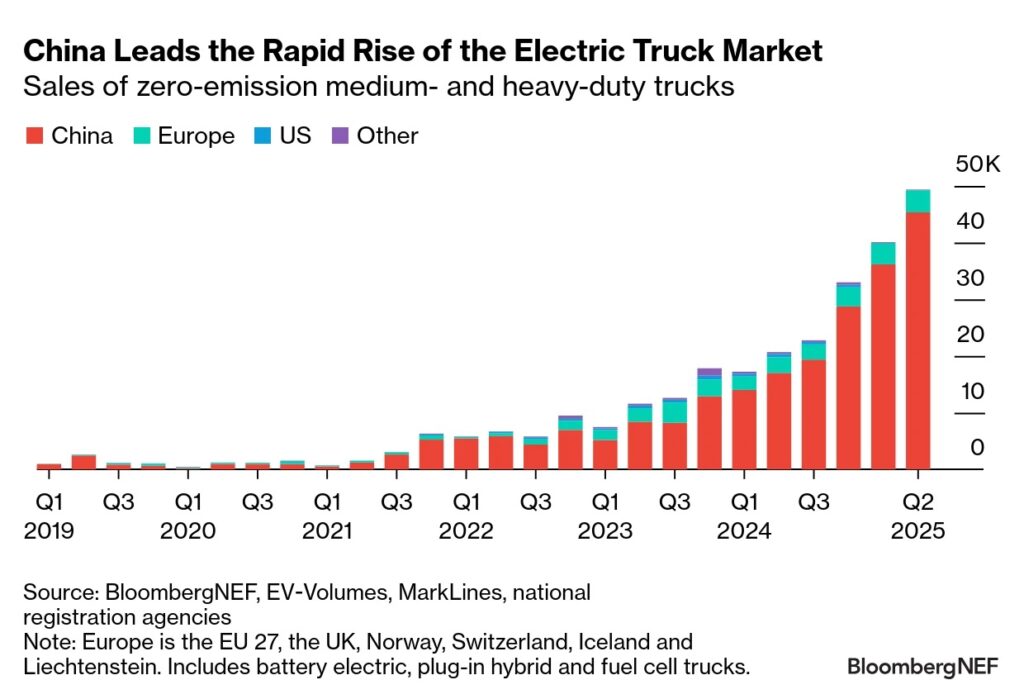 Globalt är andelen tunga lastbilar med batteridrift på väg mot 4 procent under 2025. Kina står för 90 procent av fordonen. Europamarknaden växer, medan USA faller på grund av politiska förändringar.