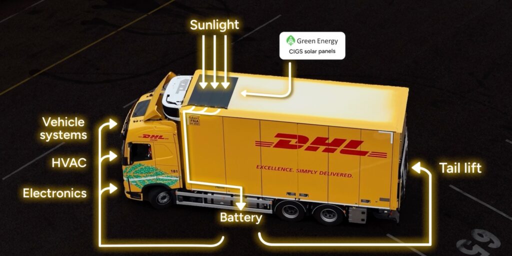 I pilotprojektet samarbetar DHL Freight med danska Green Energy Group, som levererar tunna, flexibla CIGS-paneler (koppar-indium-gallium-selenid) för fordonsintegrerad solenergi. Panelerna driver fordonens baklyft, kylanläggning och annan hjälpelektronik, vilket minskar belastningen på generatorn och därmed bränsleåtgången.