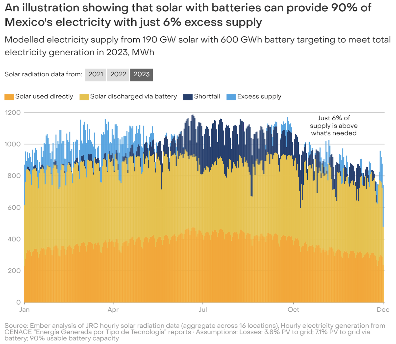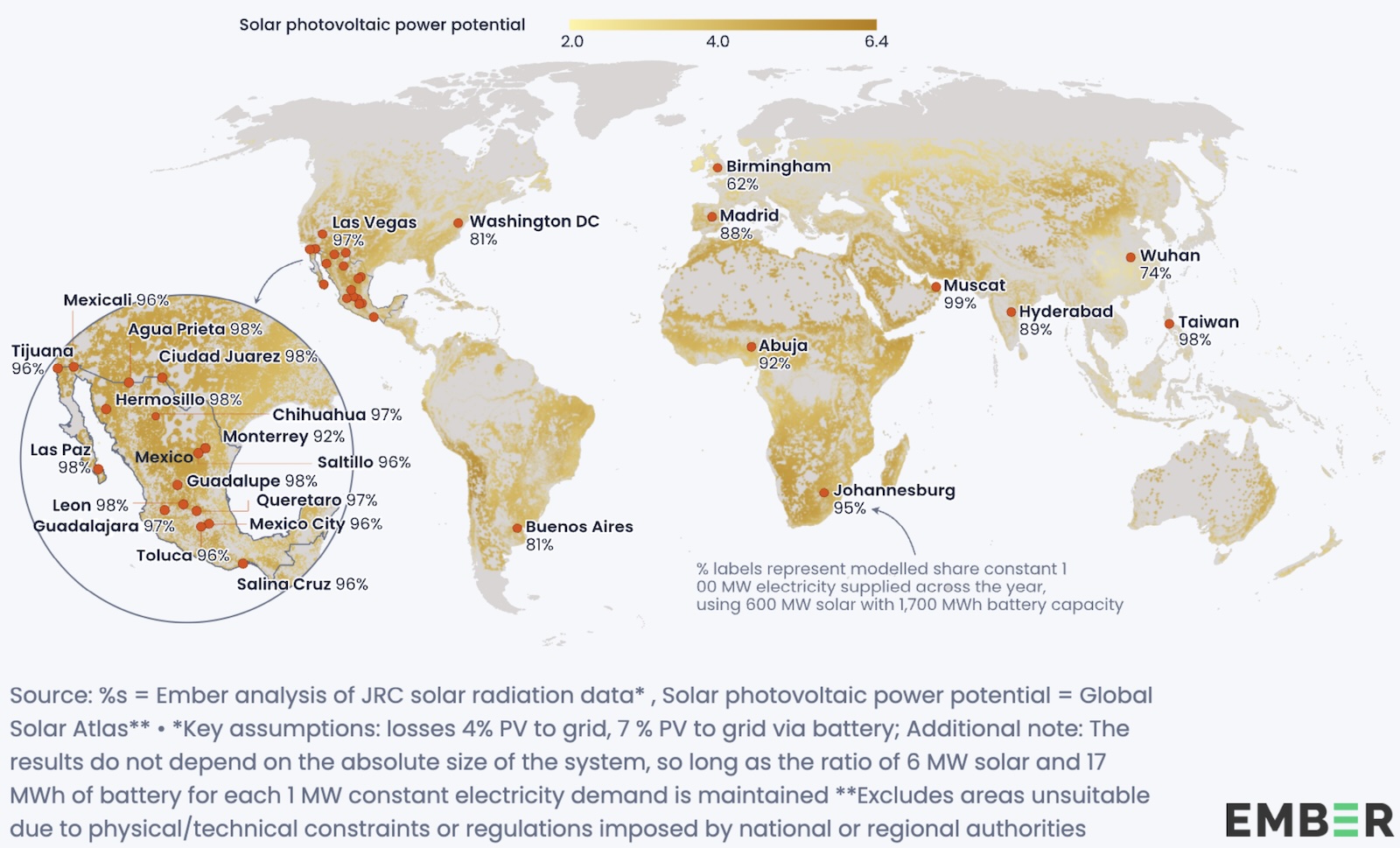 Beräkningar visar att 190 miljarder watt solenergikapacitet och 600 miljarder wattimmar batterilagring kan täcka nittio procent av Mexikos elproduktion med endast sex procent överskottsel.