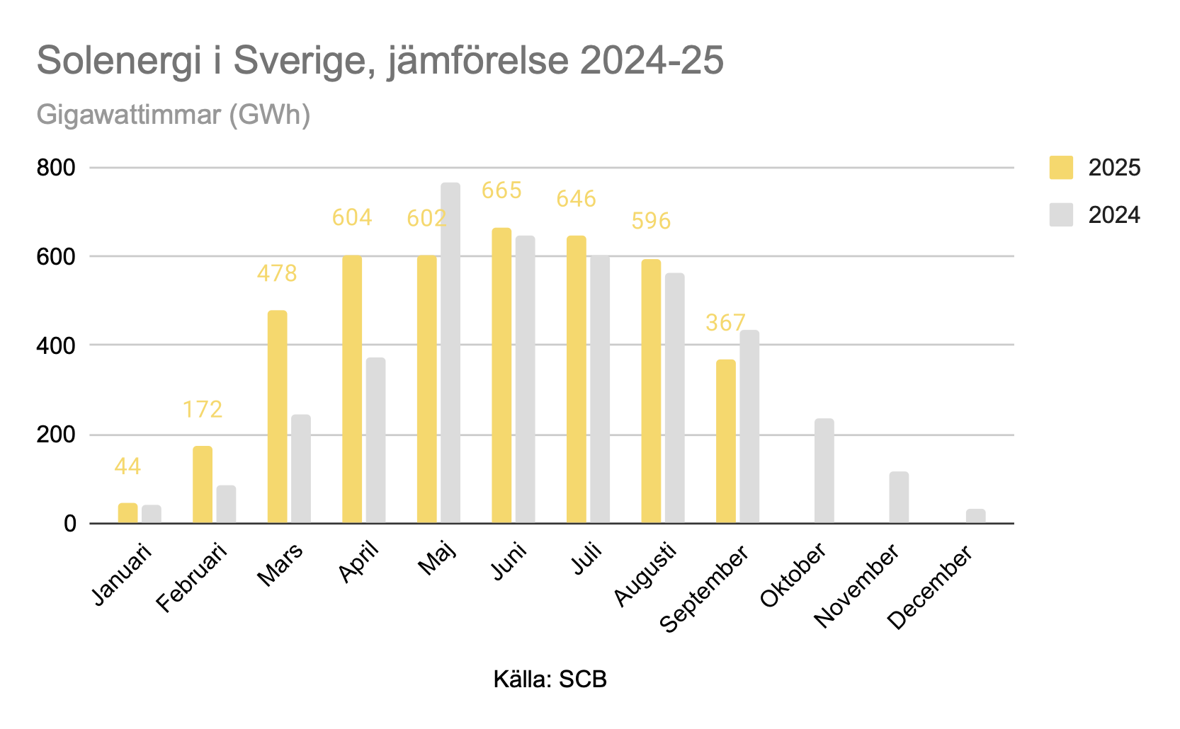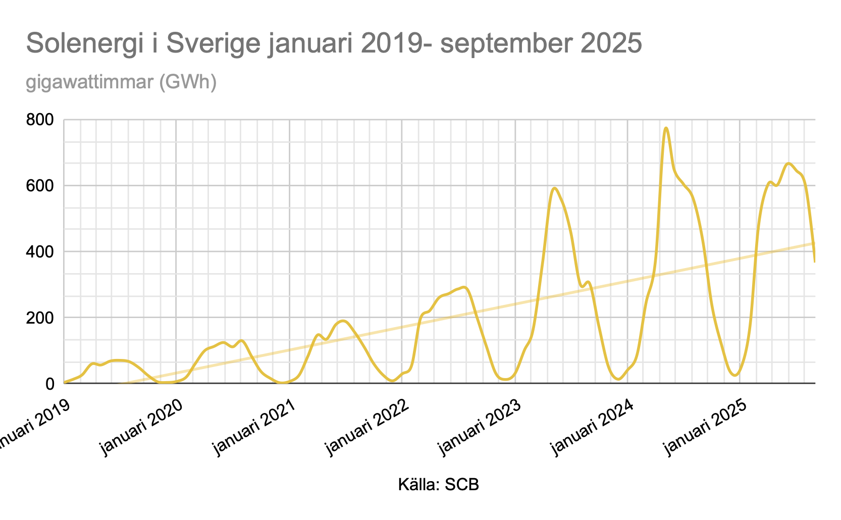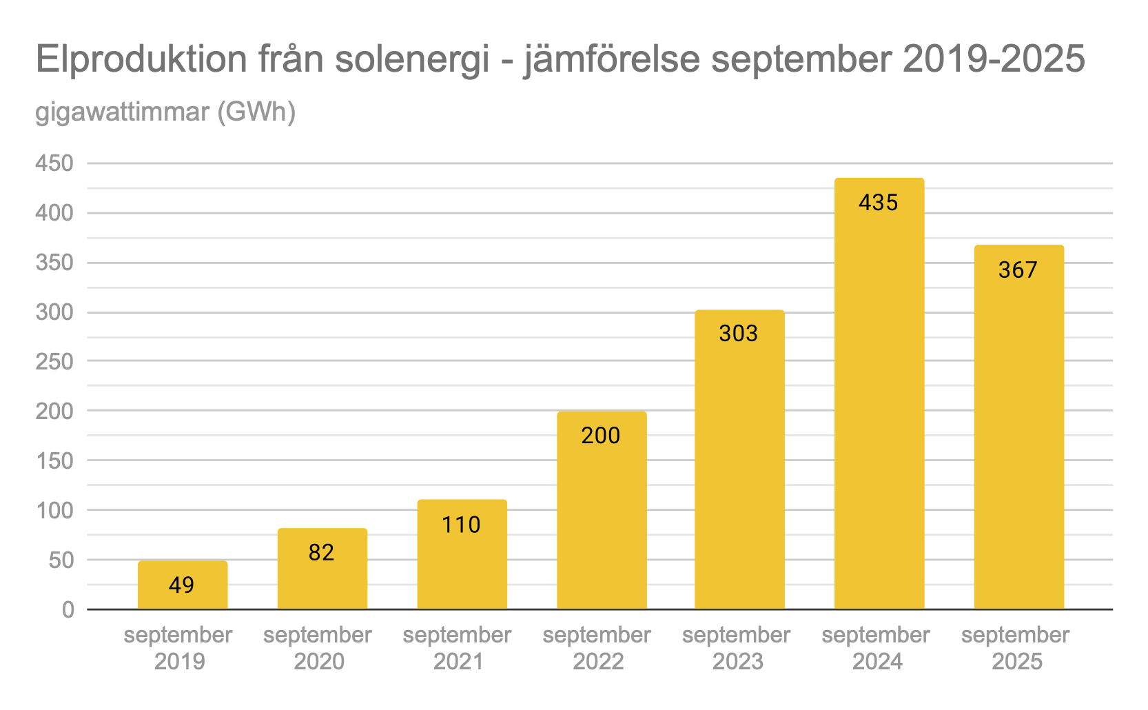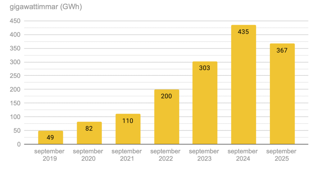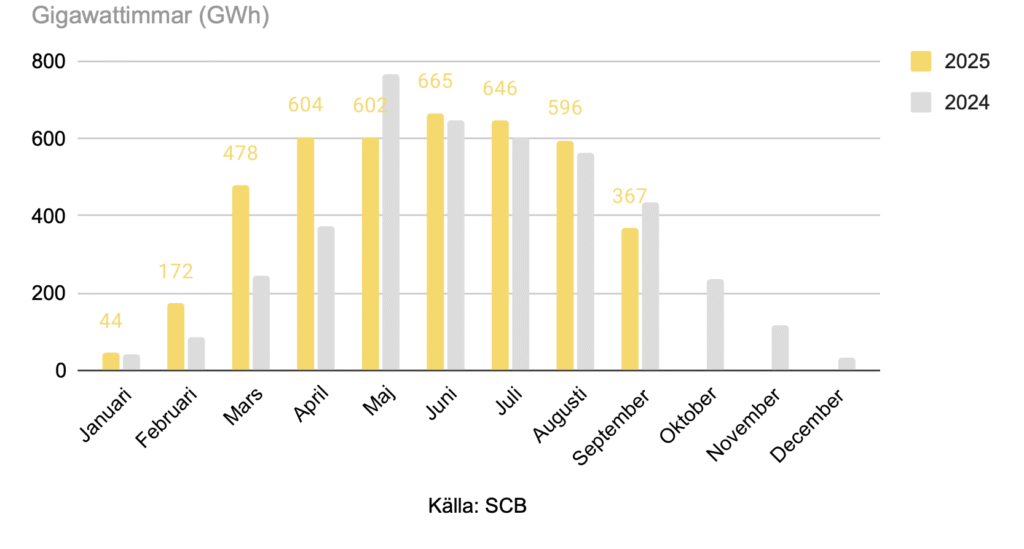 Elproduktion från solenergi i Sverige januari 2019 – september 2025 (gigawattimmar)