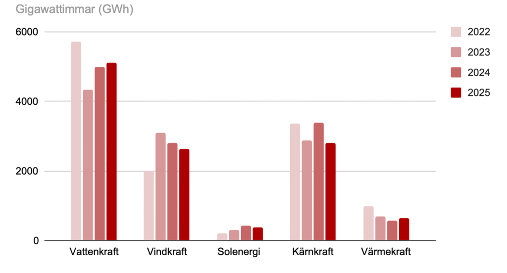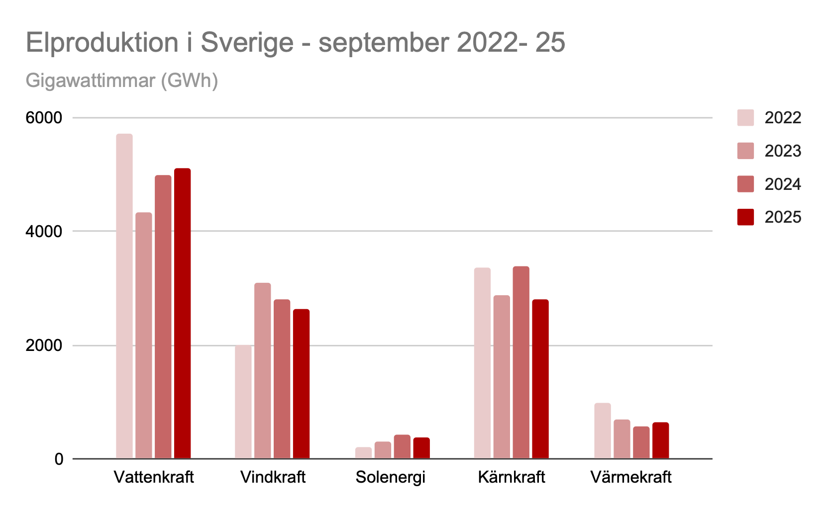 Värmekraften ökade med 13 procent och vattenkraften med 3 procent jämfört med september 2024. Vindkraft minskade med 6 procent, kärnkraft med 17 procent och solenergi med 16 procent.