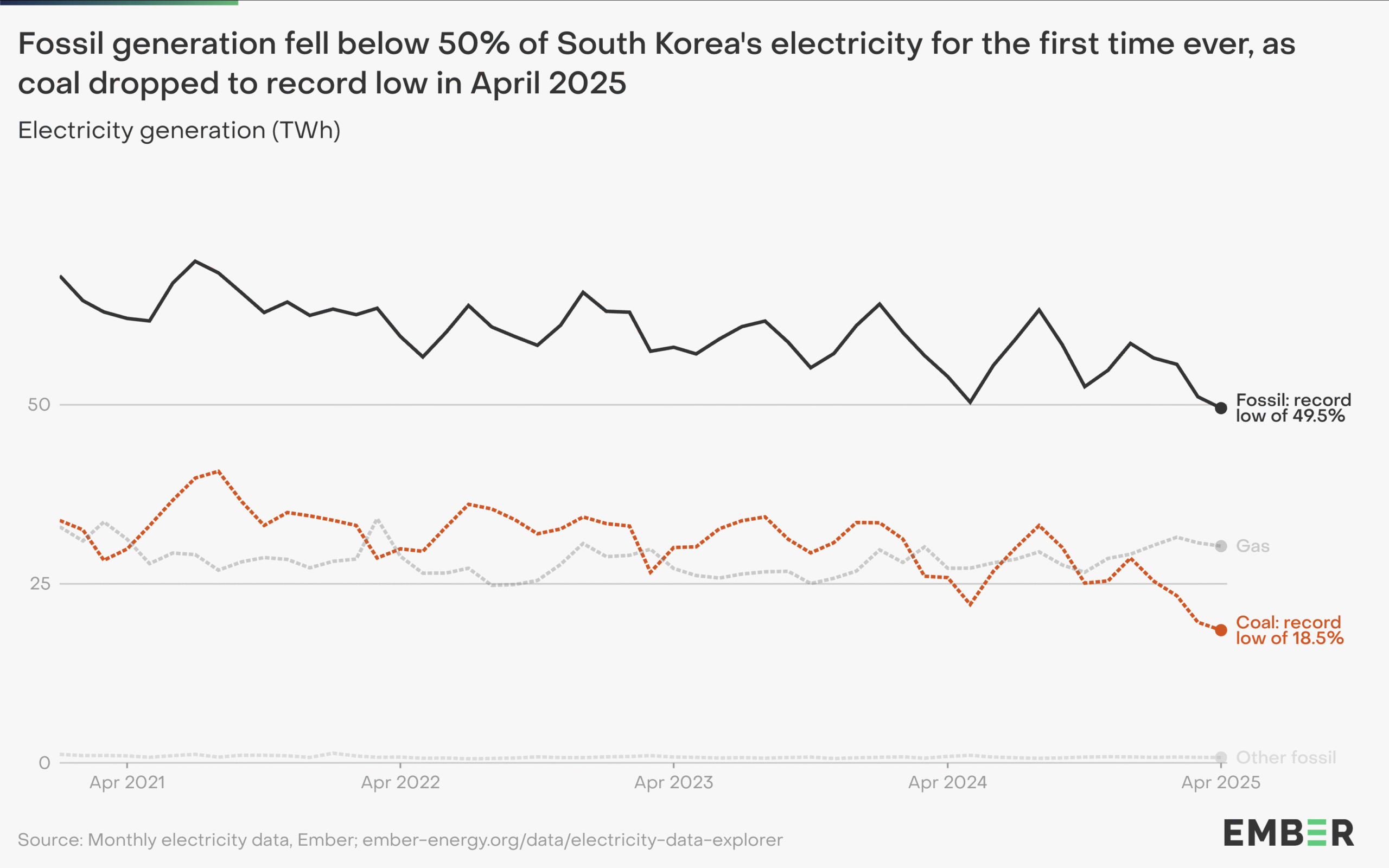 - Ember: Fossil fuels fall below 50% of South Korea’s electricity for the first month on record