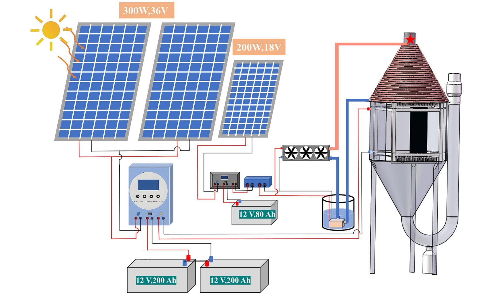 - Huvudsystemet använder två 300-wattsolpaneler som driver uppvärmningen av materialet