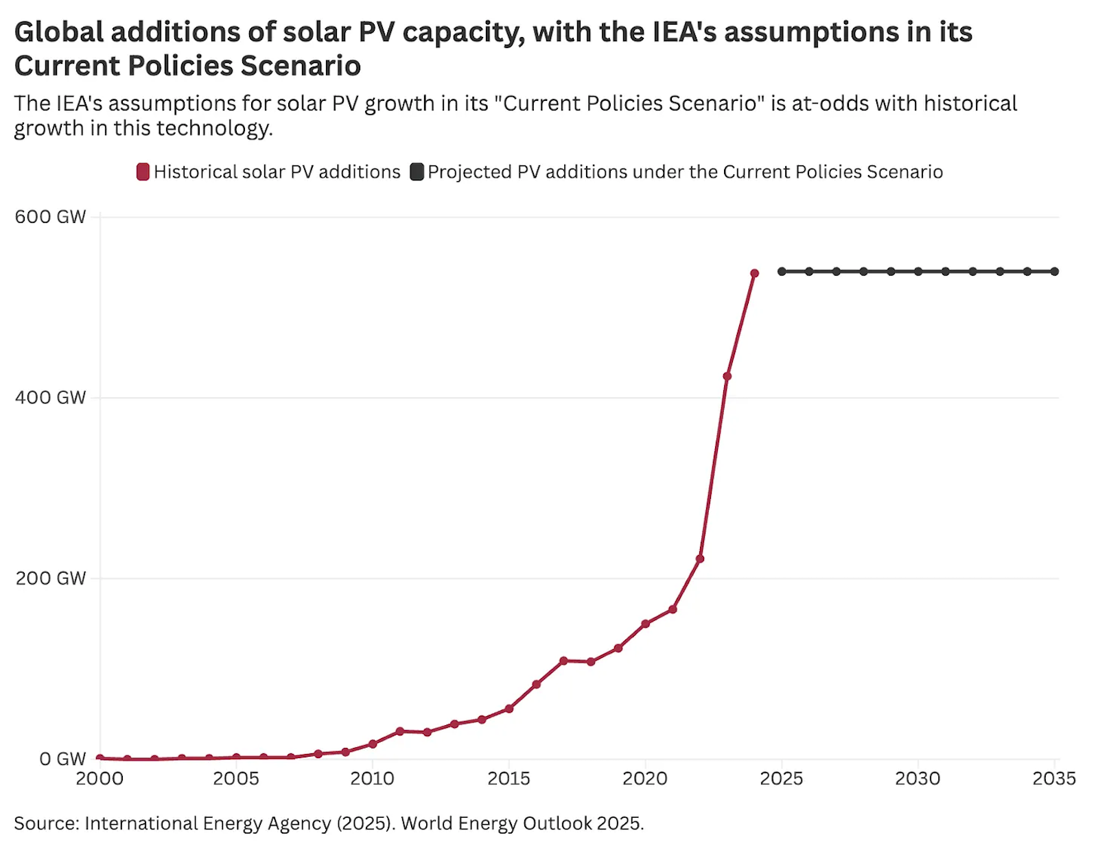 CPS förutsätter att den globala utbyggnaden stannar på 540 miljarder watt per år fram till 2035, samma nivå som 2024. Hannah Ritchie kallar detta ”överdrivet konservativt och pessimistiskt”. Hon visar det ökända diagrammet där IEA:s tidigare scenarier konsekvent underskattat solenergins tillväxt år efter år sedan 2006. Hannah Ritchie menar dock att detta antagande inte är lika förbryllande som elbilsantagandet – någon gång kommer tillväxten sakta ner, och när Kina bromsar påverkas globala siffror kraftigt.