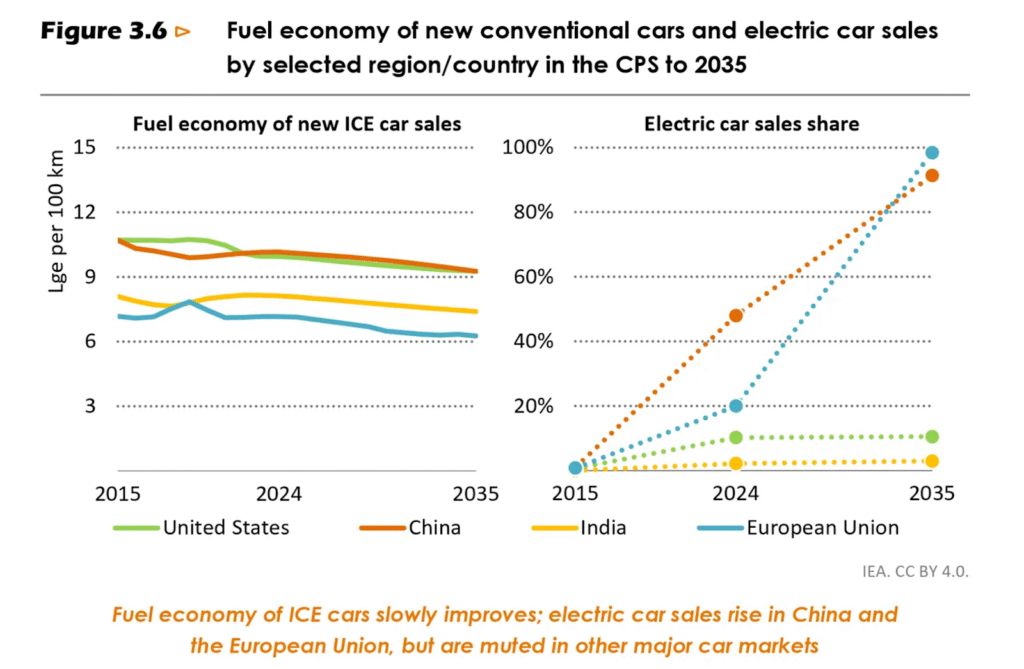 Scenariot förutsätter att elbilsandelen i USA, Indien, Brasilien, Turkiet, Kanada, Australien och Mexiko slutar växa och ligger kvar på dagens nivå till 2050. Hannah Ritchie visar diagram över hur elbilsandelen ökat kraftigt i dessa länder de senaste åren och ber läsaren föreställa sig att kurvorna plötsligt planar ut permanent. Hon skriver att detta verkar osannolikt med tanke på historisk tillväxt, att elbilar fortsätter bli bättre och billigare, och att länder vill frigöra sig från oljemarknadens svängningar.