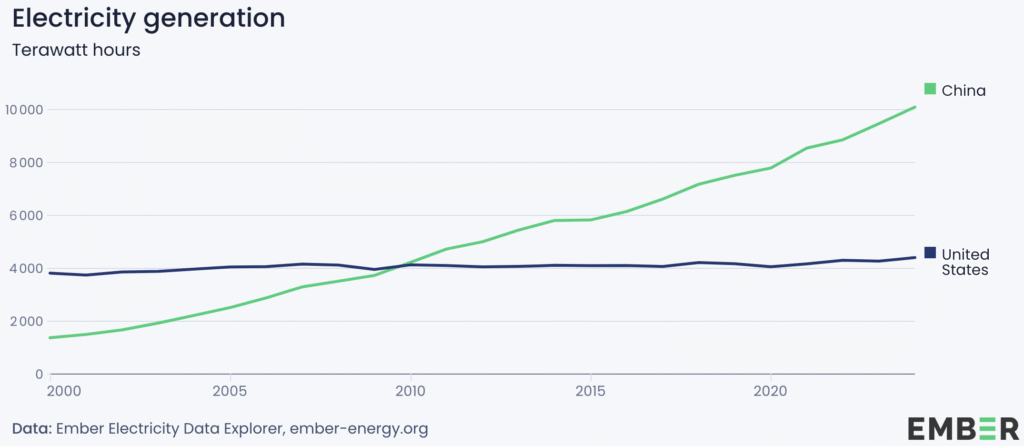 Under de senaste 12 månaderna ökade Kinas elproduktion med 430 tusen miljarder wattimmar (430 terawattimmar) medan den globala ökningen uppgick till 770 tusen miljarder wattimmar. Kina svarar alltså för mer än hälften av världens nya elproduktion. Den totala elproduktionen i Kina uppgår till 10 miljoner miljarder wattimmar jämfört med USA:s 4,5 miljoner miljarder wattimmar.