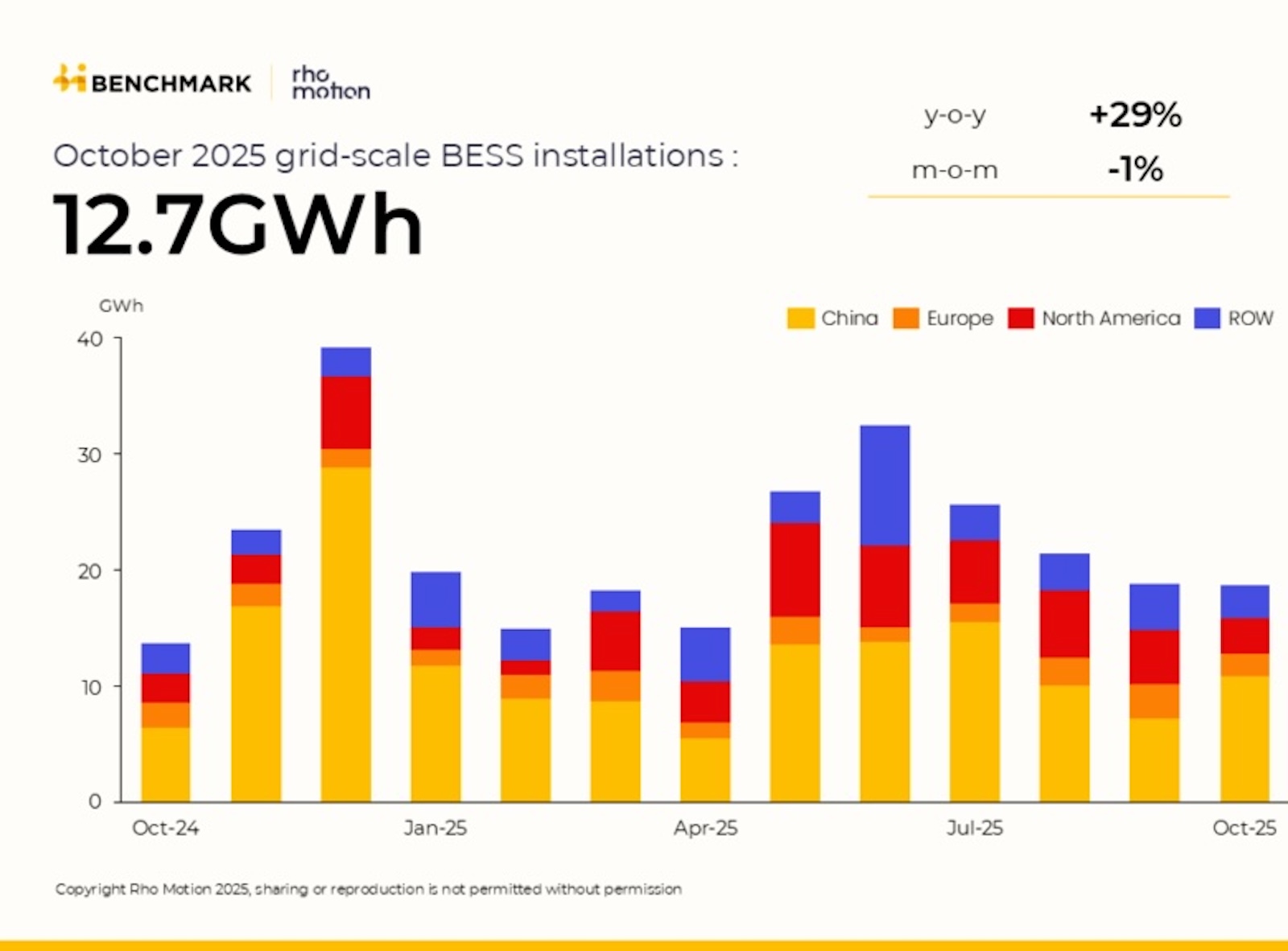 USA installerade 2,3 miljarder wattimmar under månaden, en minskning med 40 procent jämfört med september men samtidigt en ökning med 13 procent jämfört med oktober 2024. Australien tog sitt andra batteri i Waratah Super Battery i drift med 980 miljoner wattimmar, men tekniska problem med transformatorer begränsar effekten till 350 miljoner watt fram till 2026. Europa installerade strax under 500 miljoner wattimmar, inklusive ett projekt på 260 miljoner wattimmar i Bulgarien.