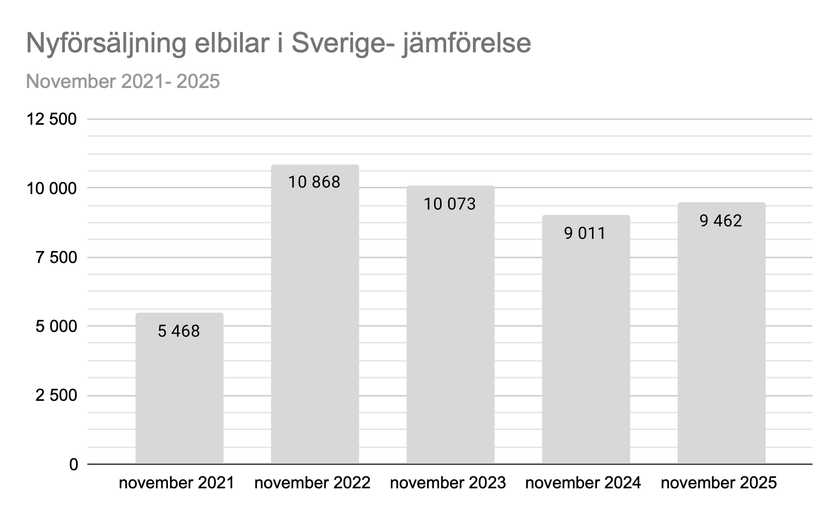 I november såldes 9 462 elbilar i Sverige jämfört med 9 011 i november 2024, en ökning med 5 procent.