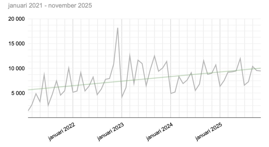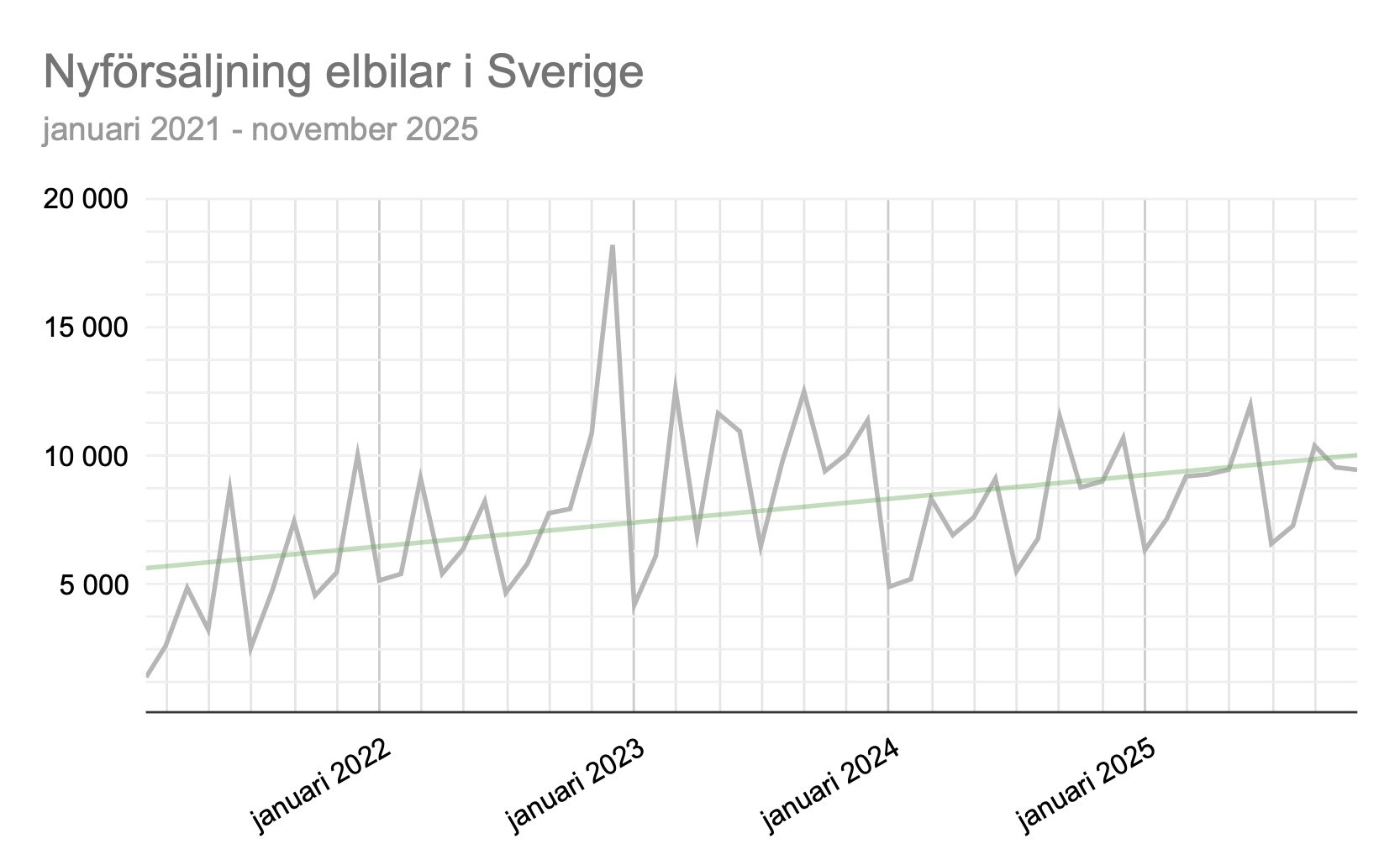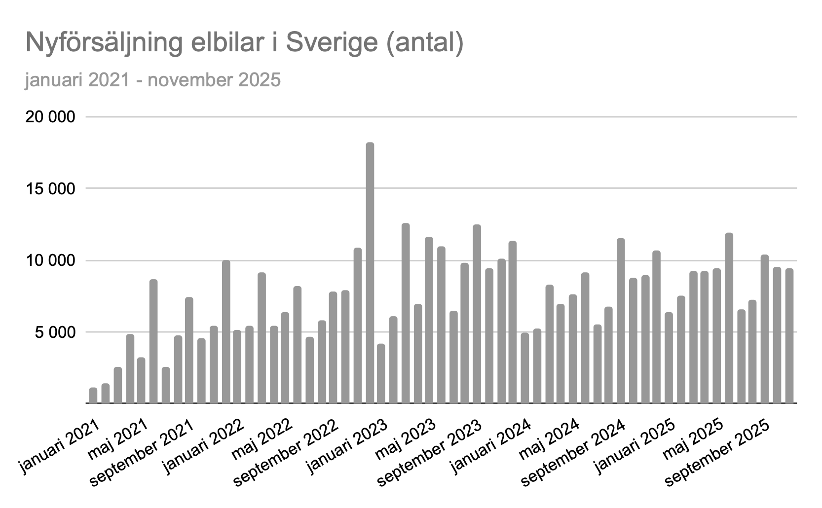 Nyförsäljning elbilar i Sverige (januari 2021 – november 2025)