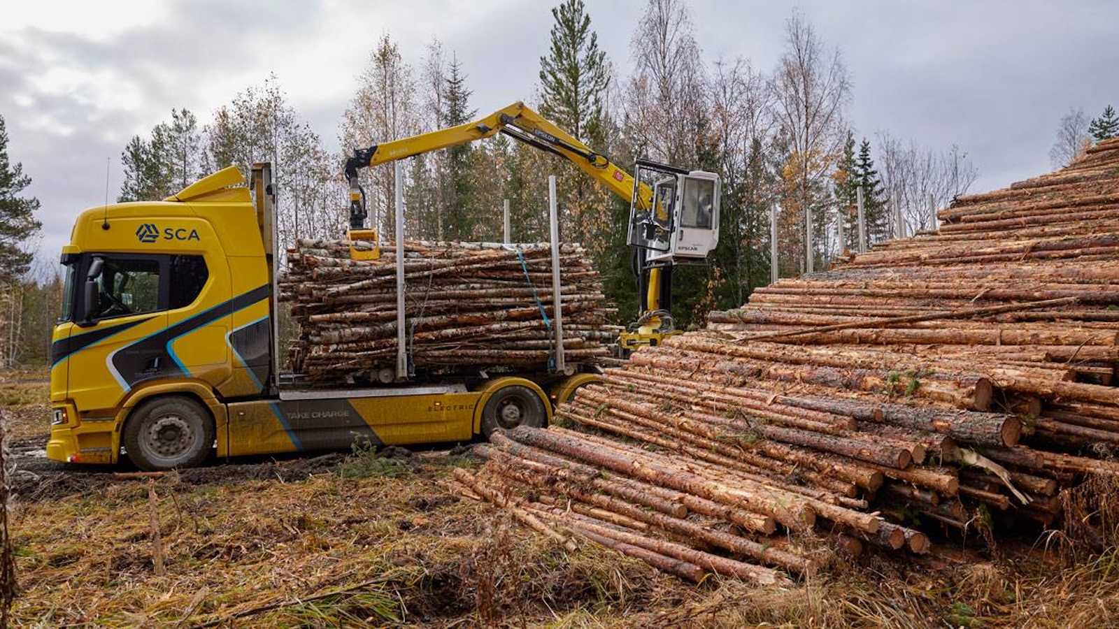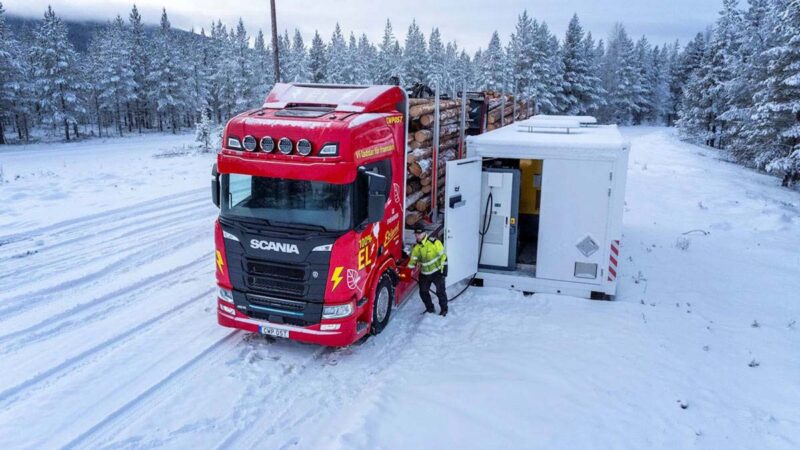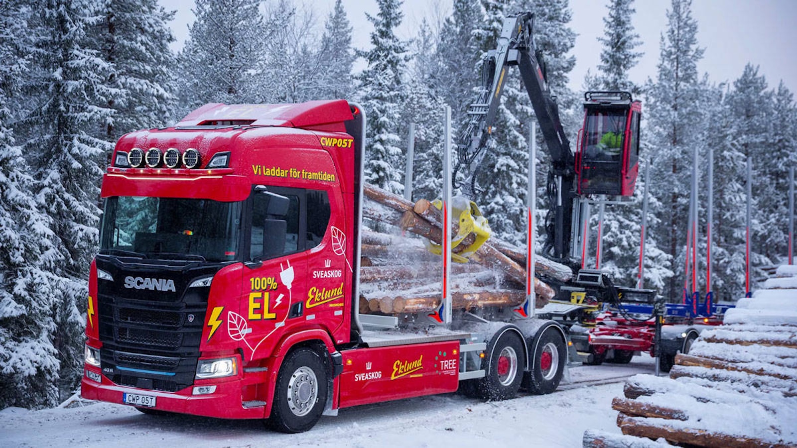 I Norr- och Västerbotten kör Eklunds Åkeri en eldiven timmerbil från Scania sedan november. Området har kallt klimat och långa transportavstånd. För att bilen ska klara körningarna har en mobil snabbladdare placerats strategiskt i skogen. Den drivs av biodiesel och ger bilen stödladdning mellan längre sträckor.