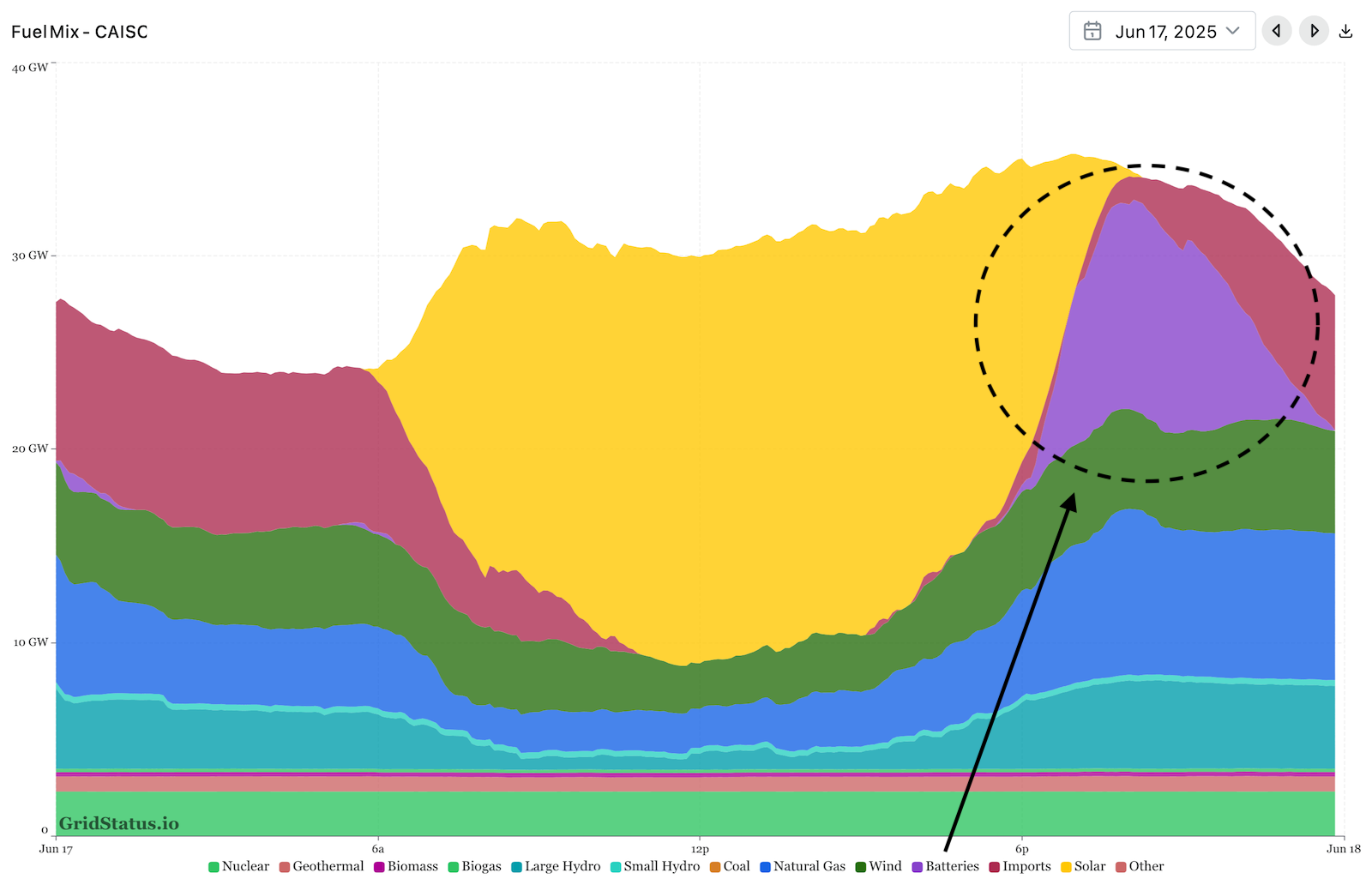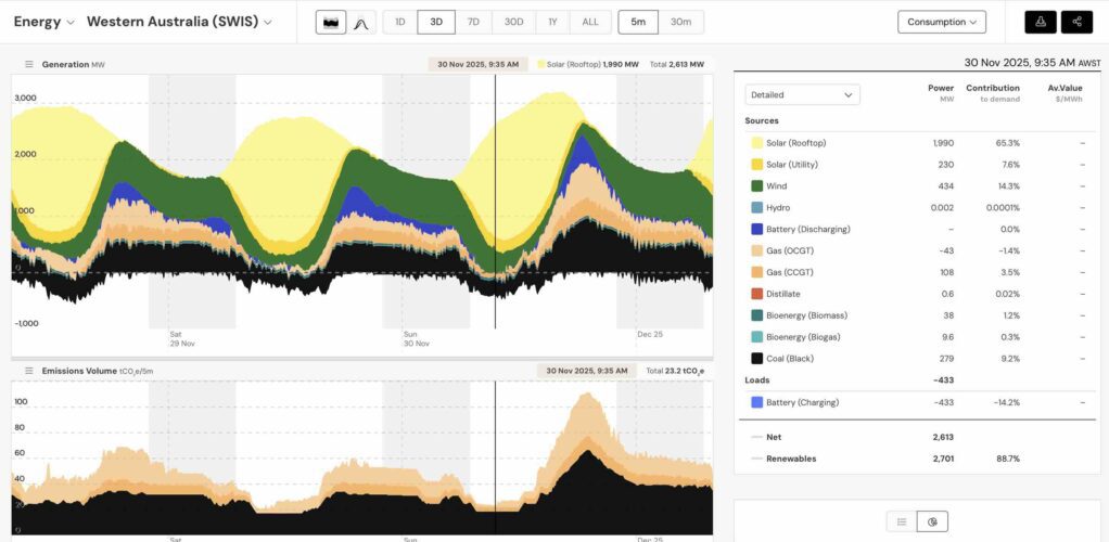 Bruttoefterfrågan var högre eftersom delstatens stora batterianläggningar – inklusive landets två största vid Collie – laddades med 443 miljoner watt. Batterierna gör det möjligt att hålla kol- och gaskraftverk igång i bakgrunden, vilket nätoperatören kräver för att ha tillräcklig flexibilitet vid eventuella störningar.