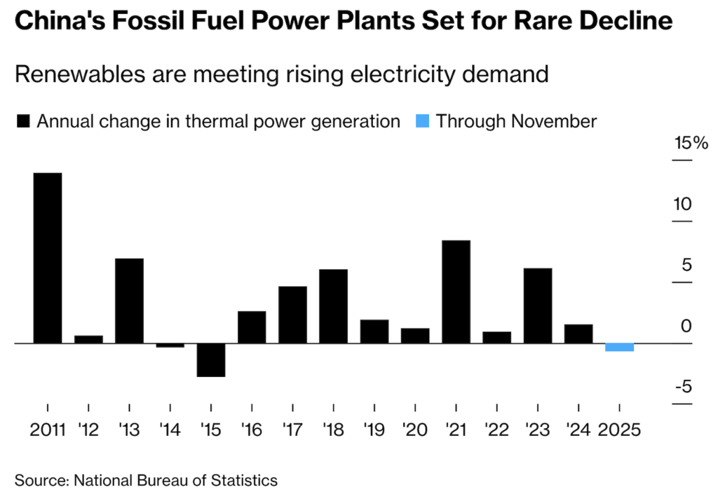 Elproduktionen från fossila bränslen sjönk med 4,2 procent i november jämfört med samma månad förra året. Sett till hela året ligger minskningen på 0,7 procent, enligt Kinas statistikmyndighet National Bureau of Statistics.