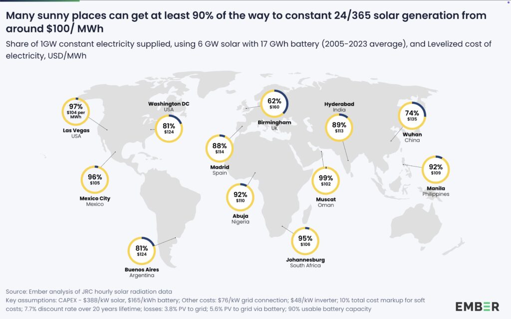 Fallande batterikostnader gör att solenergi kan leverera elektricitet dygnet runt i soliga regioner. Ember uppskattar att kombinationen solenergi och batterier kan leverera elektricitet för omkring 104 dollar per miljon wattimmar i regioner med mycket sol. Det är billigare än nya kol- och kärnkraftverk.