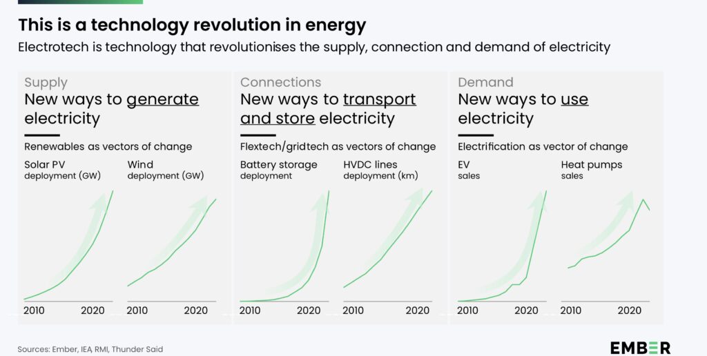 Solenergi växte mer än tre gånger så mycket som någon annan energikälla. Diagrammen från Ember visar att solenergitillskottet var 498 tusen miljarder wattimmar, jämfört med vindkraftens 137 tusen miljarder wattimmar. Fossilbränslen minskade med 17 tusen miljarder wattimmar under samma period.
