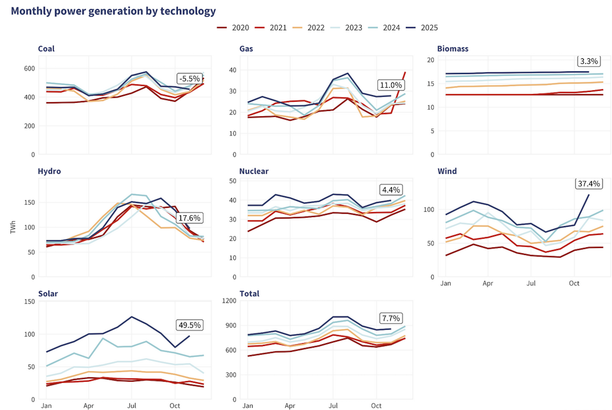 I november täckte solenergi och vindkraft hela den ökade efterfrågan på elektricitet. Kolets andel av elproduktionen sjönk till 53 procent i november och till 55 procent totalt under årets första elva månader – en minskning med fyra procentenheter jämfört med förra året. Termisk elproduktion (främst kol) minskade med 0,7 procent under perioden, och koleldad elproduktion föll med 5,5 procent i november.
