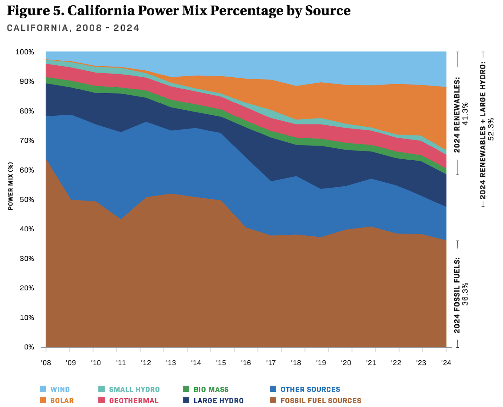 Kalifornien visar hur stora utsläppsminskningar kan kombineras ekonomisk tillväxt. Den snabba utbyggnaden av batterilagring gör det möjligt att lagra solenergi under dagen för användning på kvällen, vilket minskar behovet av fossilgas för att balansera elnätet.