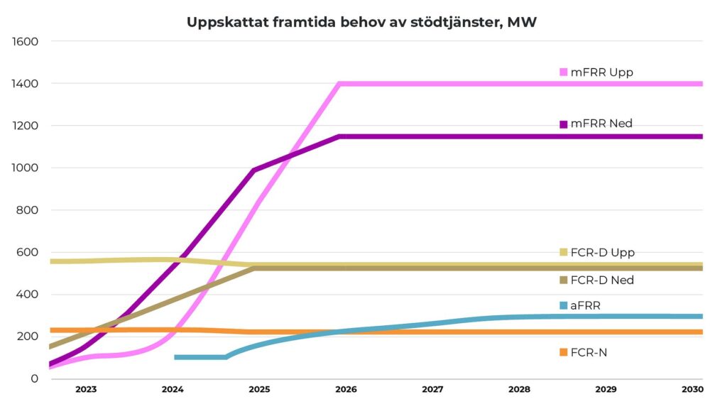 Behovet av sådana stödtjänster har ökat kraftigt. I mars 2025 införde Svenska kraftnät nya regler med en ny marknad, mFRR EAM, som sätter priset för obalanser i varje elområde. Enligt Svenska kraftnäts egna uppskattningar väntas behovet av mFRR öka från omkring 200 miljoner watt 2023 till över 1 400 miljoner watt 2026 för uppåtreglering, och till cirka 1 150 miljoner watt för nedåtreglering.