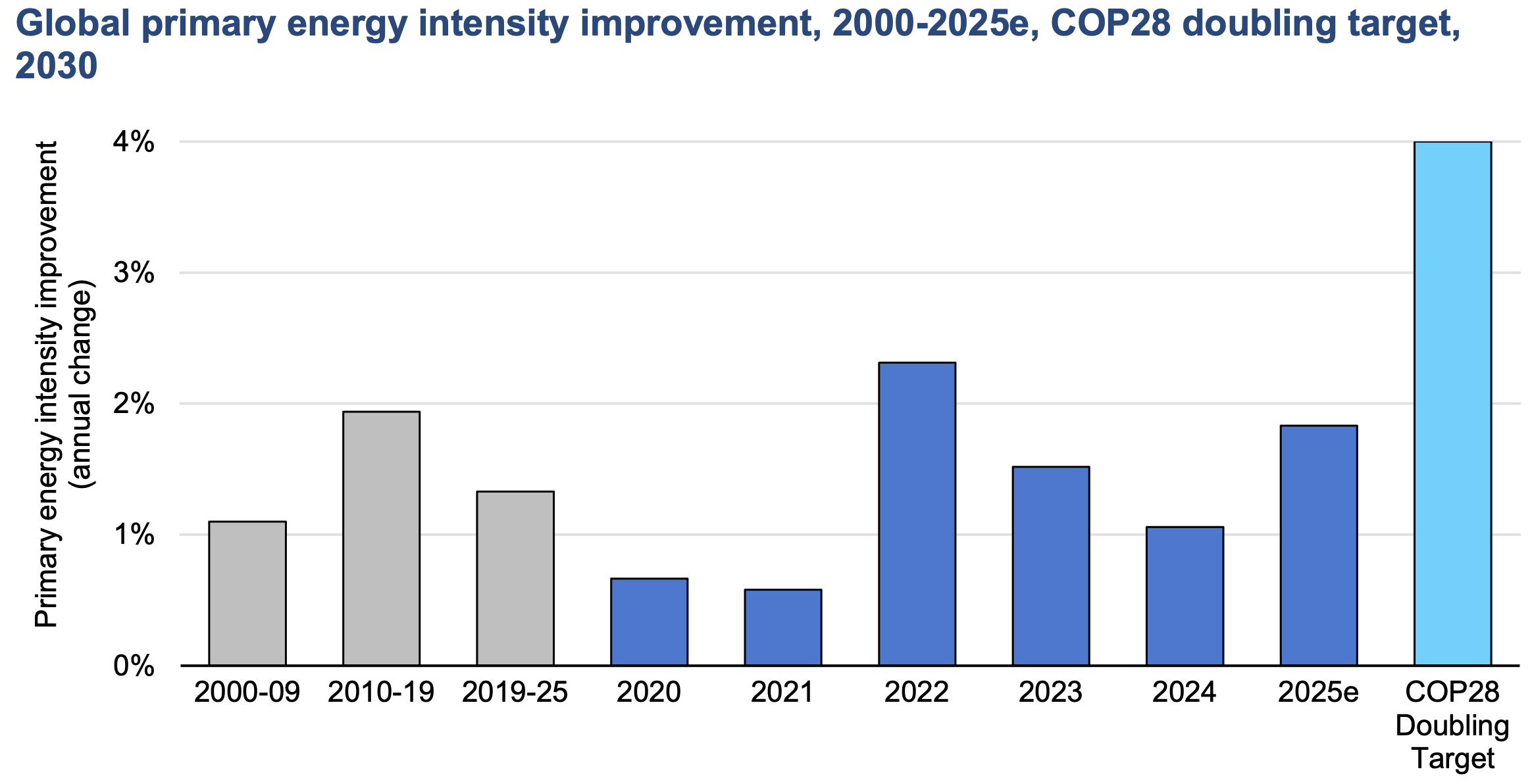 Förbättringen accelererar. Den globala energiintensiteten – ett mått på hur mycket energi som krävs för att producera ekonomiskt värde – väntas minska med 1,8 procent under 2025. Det är en uppgång från bara 1 procent 2024. Men det är långt under målet på 4 procent årlig förbättring som nästan 200 länder enades om vid COP28. Sedan 2019 har den genomsnittliga förbättringstakten bara varit 1,3 procent per år, en tydlig nedgång jämfört med 2 procent per år under perioden 2010–2019.
