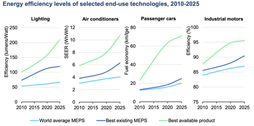 Utan effektivitetsförbättringar sedan 2010 hade dagens växthusgasutsläpp varit 20 procent högre. Hushållens energiräkningar i utvecklade ekonomier har minskat med upp till 20 procent tack vare effektivare teknik. Industrin producerar 20 procent mer ekonomiskt värde per energienhet än år 2000.