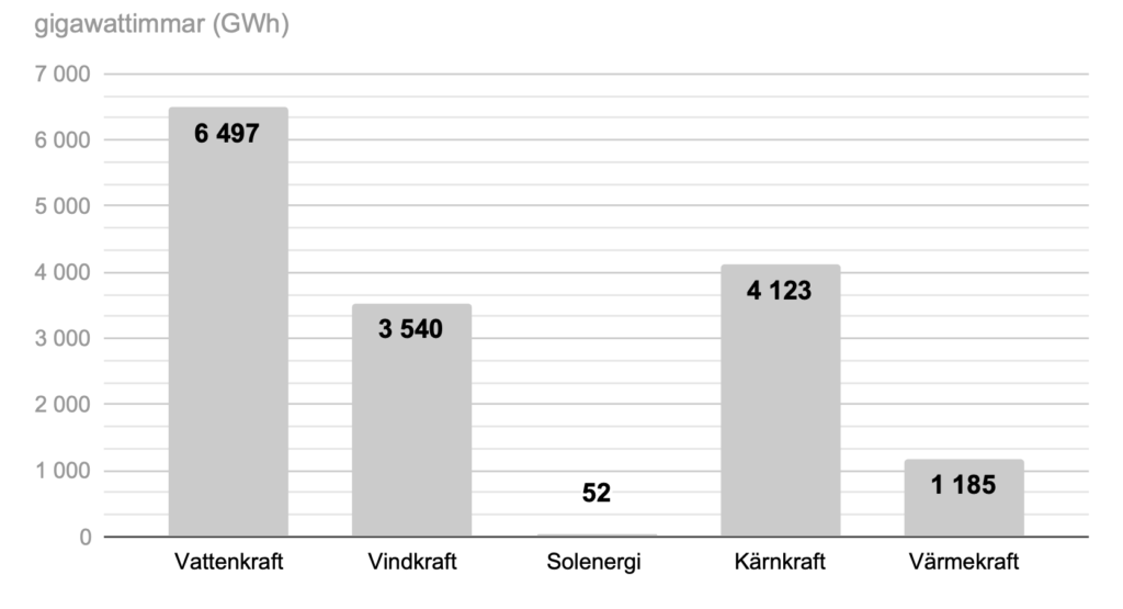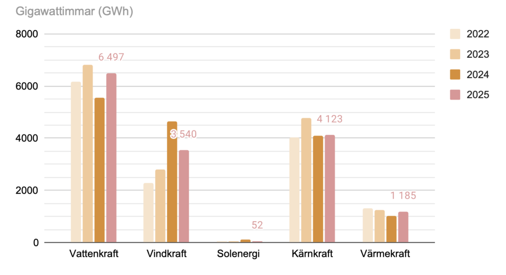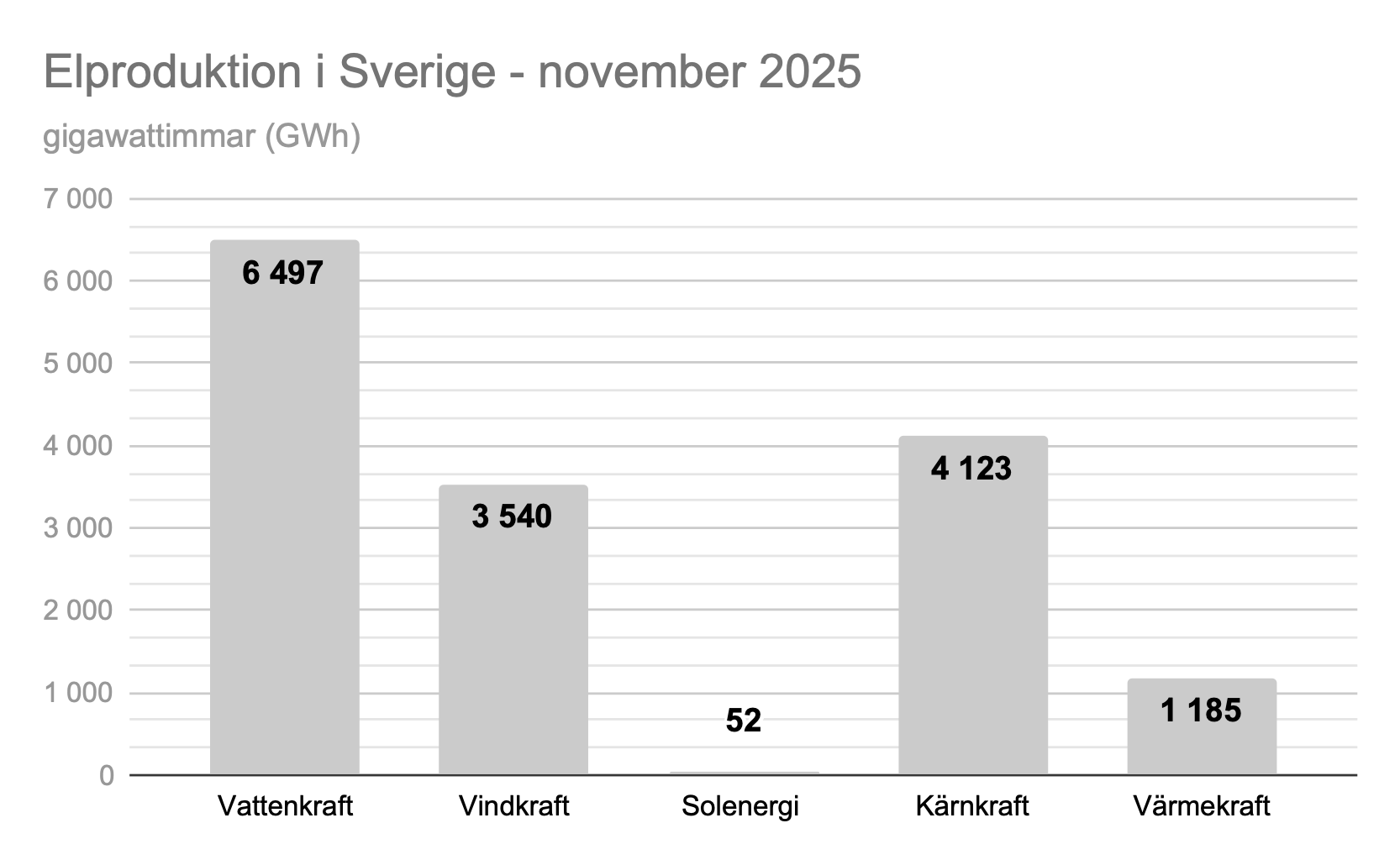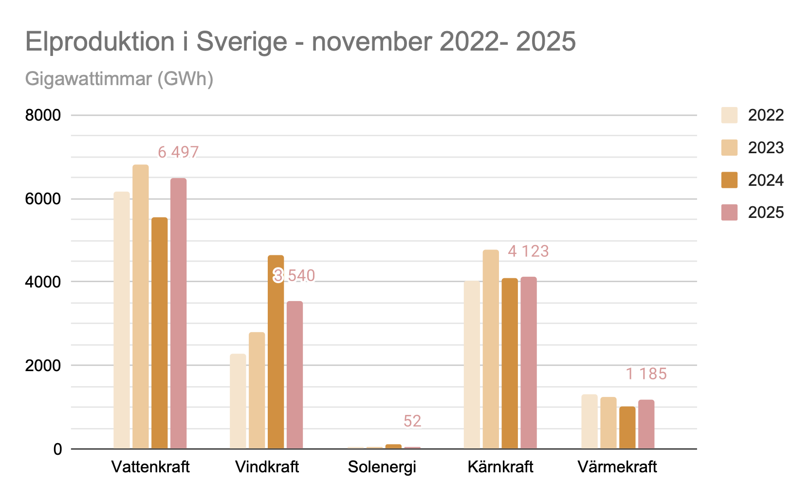 Vattenkraften ökade med 17 procent, värmekraften med 14 procent och kärnkraften en procent jämfört med november 2024. Vindkraft minskade med 24 procent och solenergi med 56 procent.
