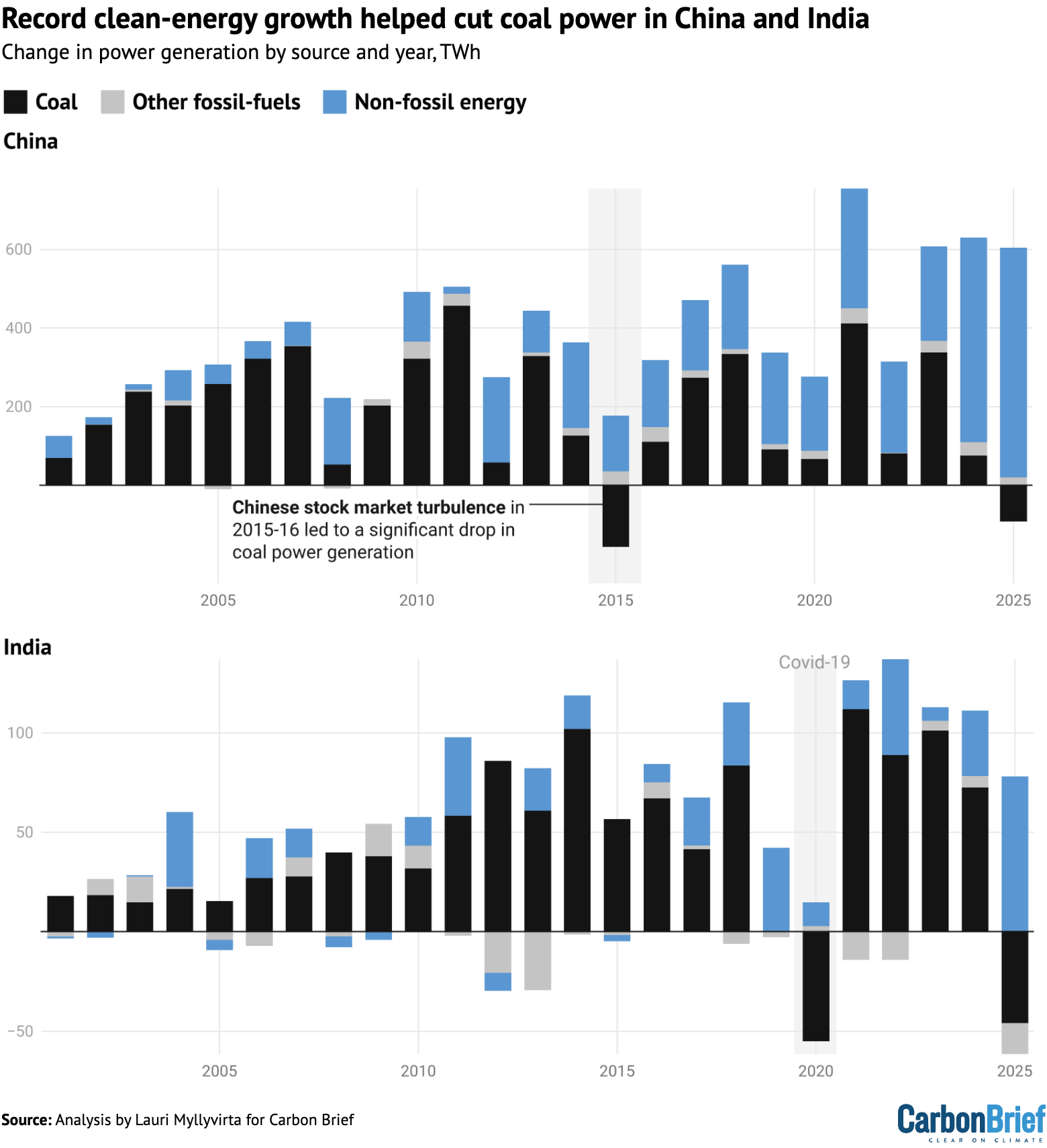 - Carbon Brief: Coal power drops in China and India for first time in 52 years after clean-energy records