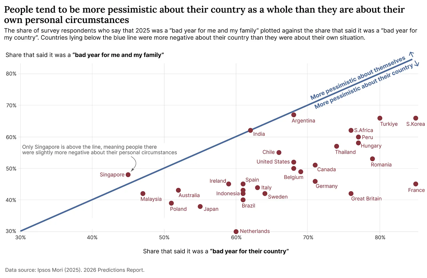 En färsk Ipsos-undersökning i 30 länder bekräftar bilden. När folk tillfrågades om 2025 var ett dåligt år svarade 85 procent av fransmännen att det var ett dåligt år för Frankrike – men bara 45 procent sa att det var dåligt för dem personligen. Nederländerna visade liknande mönster: 60 procent sa dåligt för landet, men bara hälften så många sa dåligt för sig själva. Nästan alla länder i undersökningen låg under jämviktslinjen, vilket betyder att folk var mer negativa om landet än om sig själva.