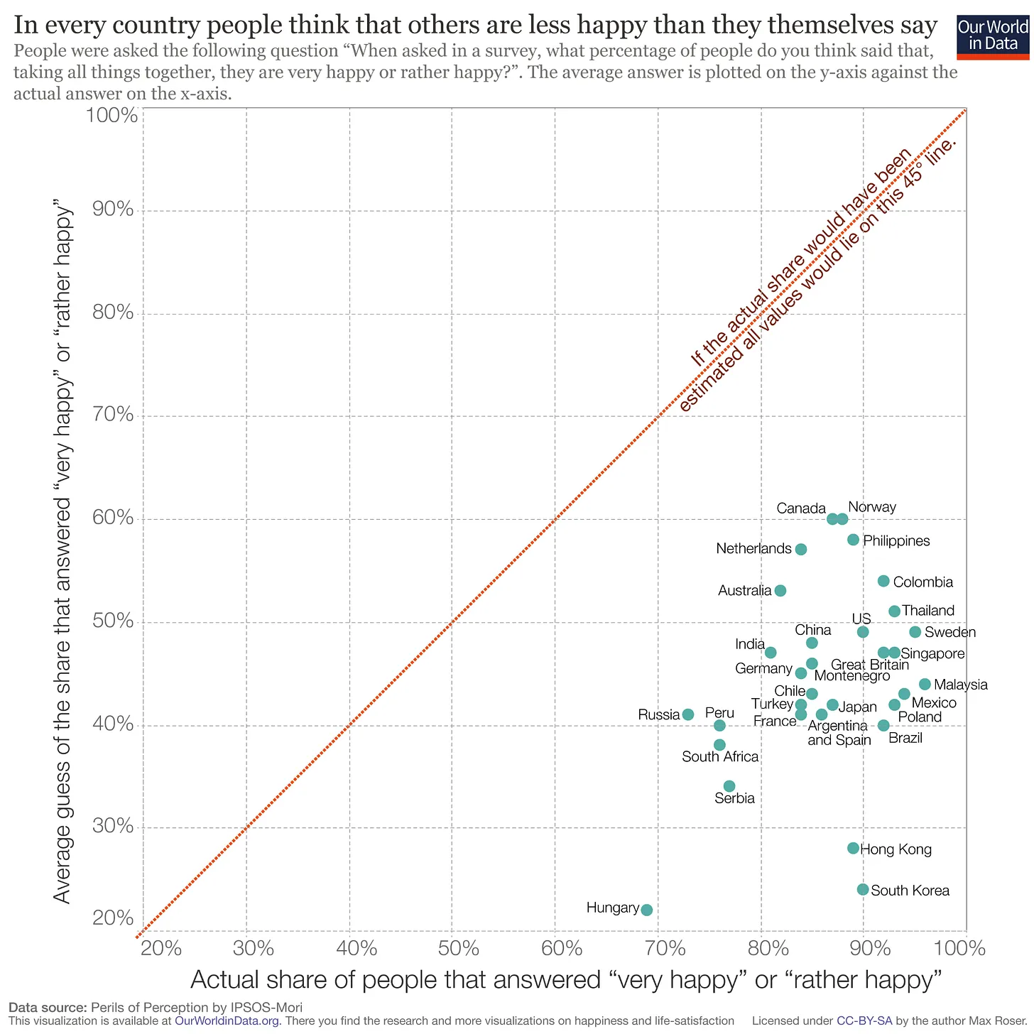 I Sydkorea trodde folk att bara 25 procent av deras landsmän var lyckliga. I verkligheten svarade 90 procent att de var ganska eller mycket lyckliga. Samma mönster återkom i alla undersökta länder.