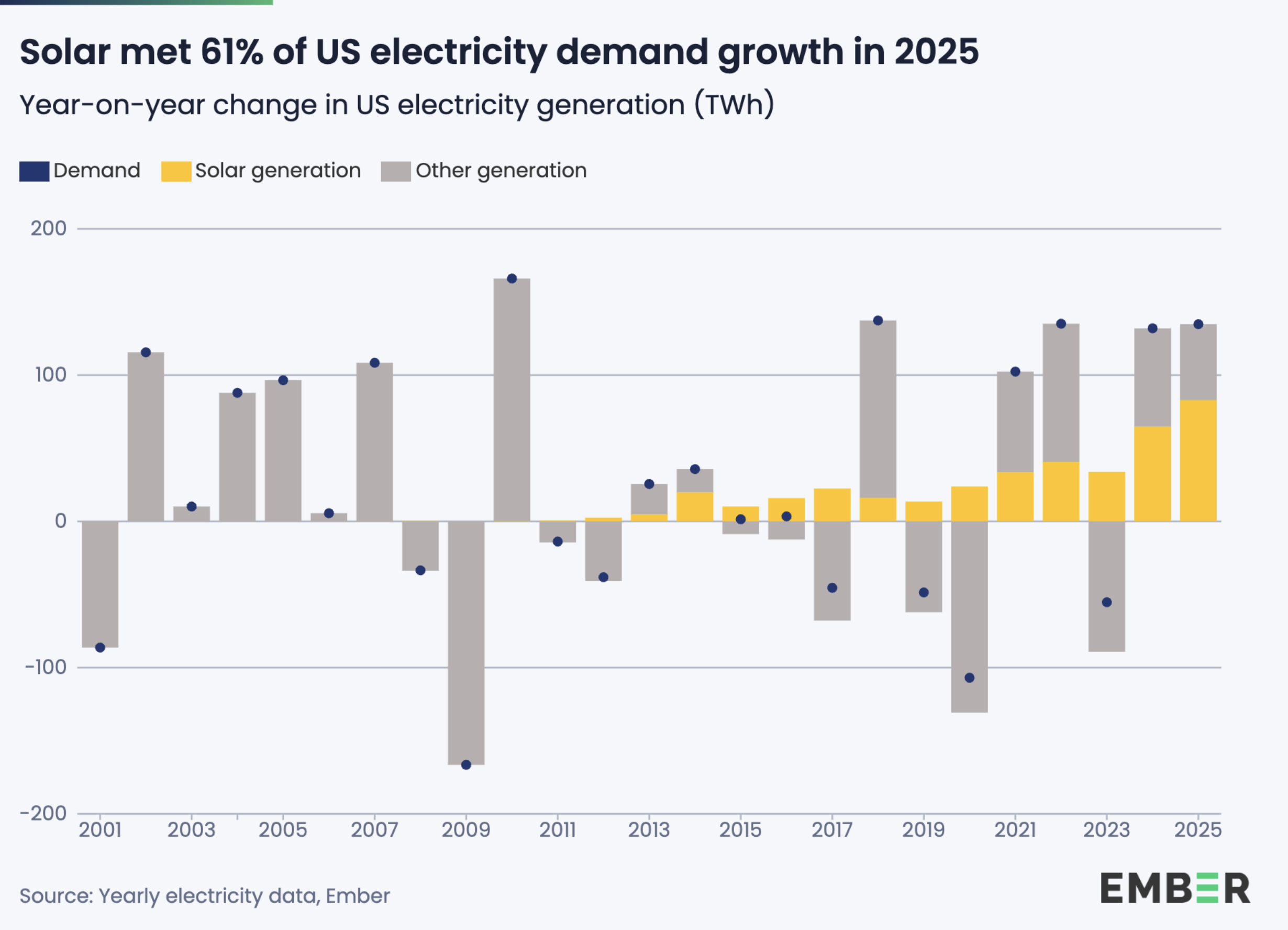 Efterfrågan på elektricitet i USA ökade med 135 tusen miljarder wattimmar (terawattimmar) under 2025, den fjärde största ökningen på ett decennium. Samtidigt ökade elproduktionen från solenergi med rekordstora 83 tusen miljarder wattimmar, en ökning på 27 procent. Det innebär att solenergi ensamt täckte nästan två tredjedelar av landets ökade elbehov.