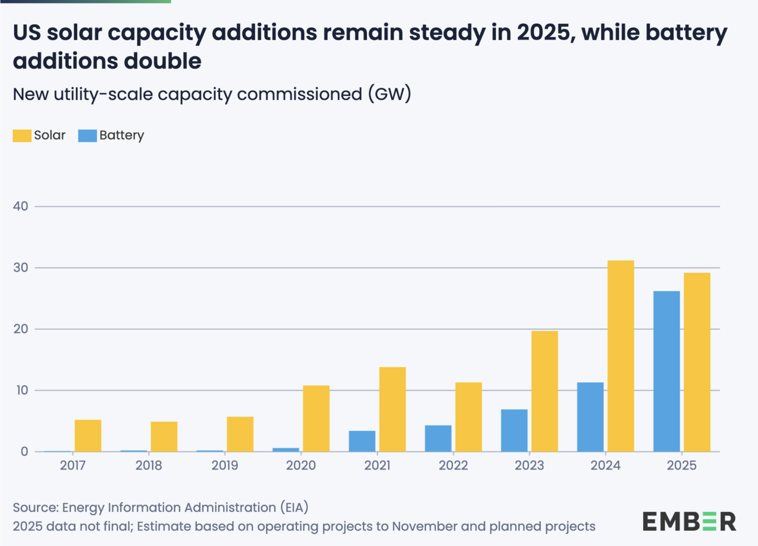 Solenergin stod för 8,5 procent av all elektricitet i USA under året. Ökningen drevs av storskaliga solenergianläggningar, medan mindre anläggningar på hustak bidrog marginellt. Vädret spelade ingen roll – solinstrålningen var oförändrad jämfört med 2024.