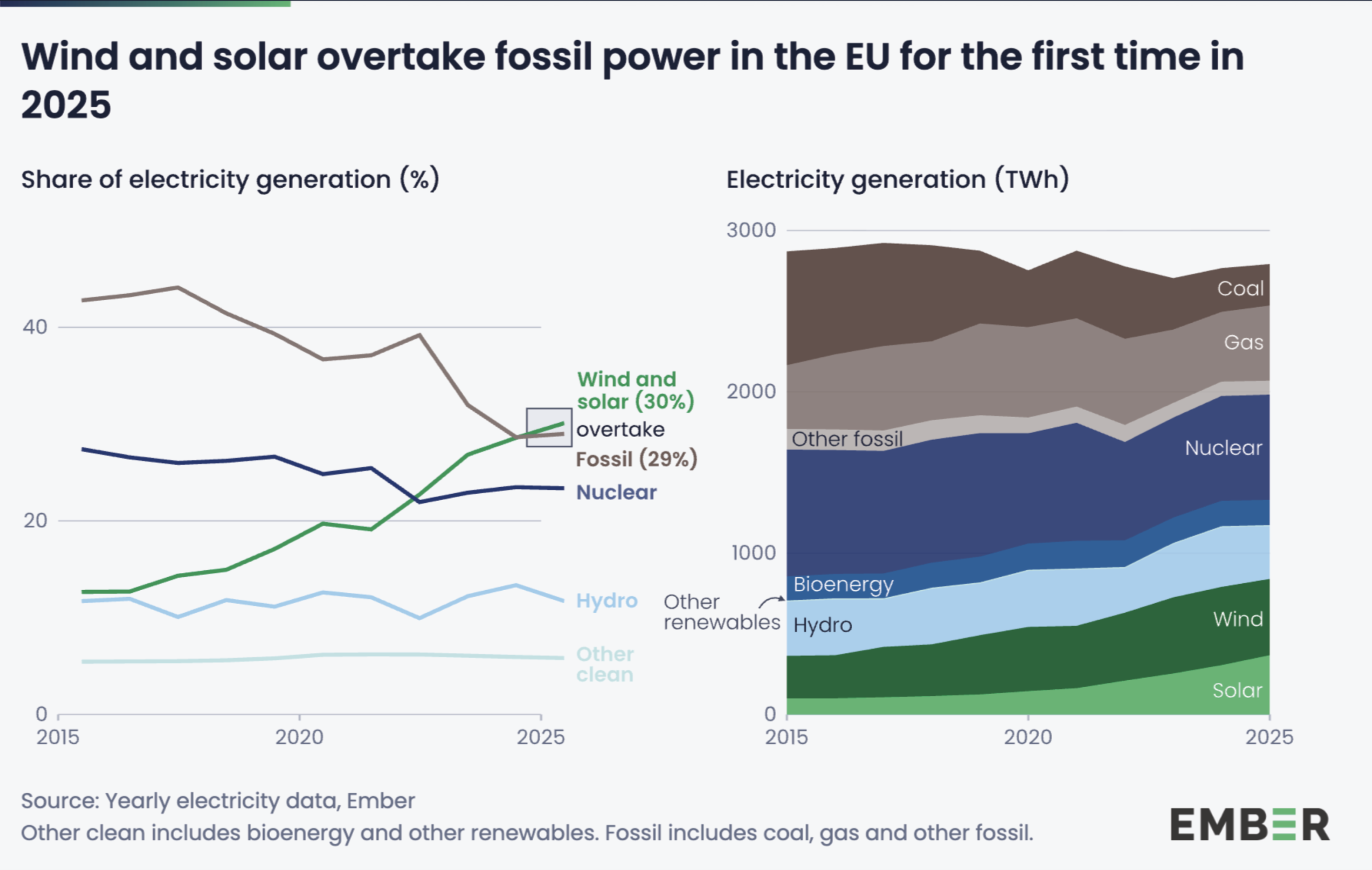 Fri energi från vindkraft och solenergi stod för 30 procent av EU:s elproduktion 2025, medan fossila bränslen sjönk till 29 procent. Det är en dramatisk förändring – för bara fem år sedan var förhållandet det omvända, med fossila bränslen på 37 procent och vindkraft plus solenergi på 20 procent.