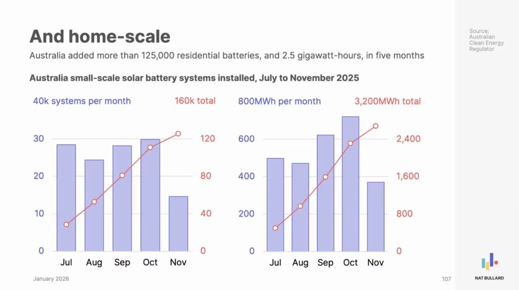 Australien sticker ut på ett annat sätt. Landets subventioner för hembatterier har lett till över 200 000 installationer sedan programmet utökades, med en sammanlagd kapacitet på 4,6 miljarder wattimmar. Bara mellan juli och november 2025 installerades 125 000 nya hembatterier.