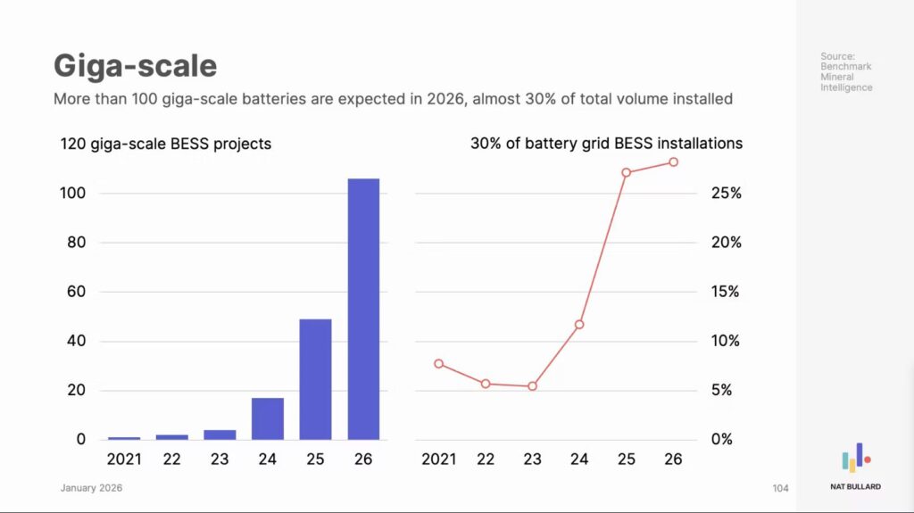 Antalet storskaliga batteriprojekt – anläggningar på minst en miljard watt – har också ökat kraftigt. År 2021 fanns bara ett par sådana projekt. År 2025 hade antalet stigit till omkring 50. Under 2026 väntas över 120 storskaliga projekt tas i drift, vilket motsvarar nästan 30 procent av all ny batterikapacitet som installeras globalt.