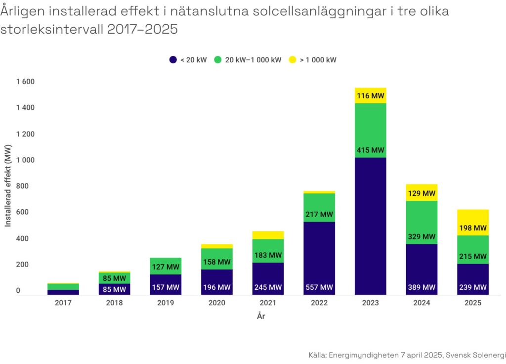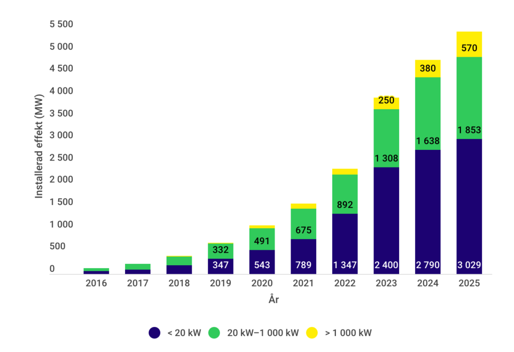 Den svenska solenergimarknaden genomgår ett skifte. Medan villamarknaden och kommersiella anläggningar minskade under 2025, växte den storskaliga solenergin med 46 procent. Storskaliga anläggningar stod för 30 procent av årets installationer, jämfört med bara 7 procent 2024.